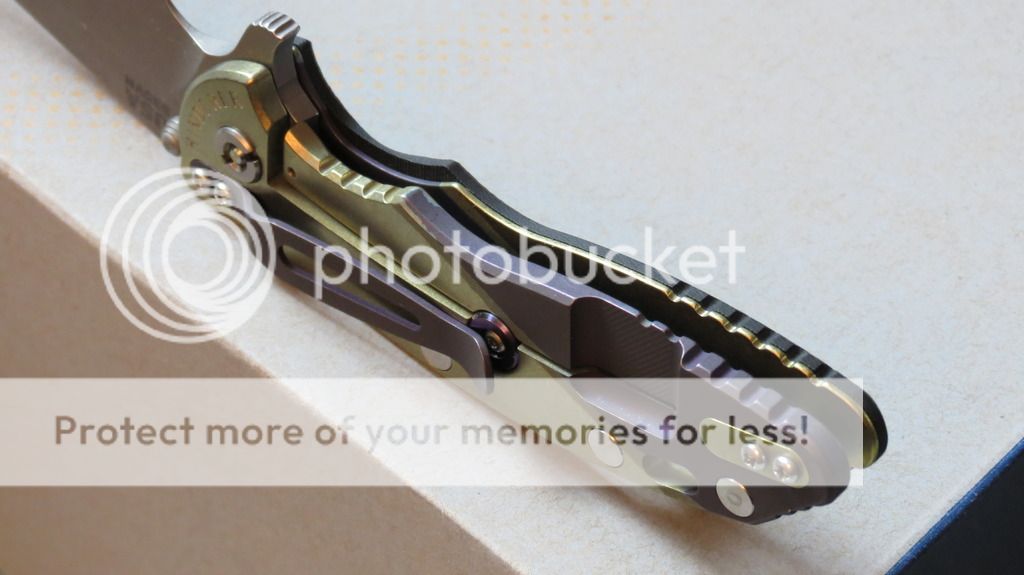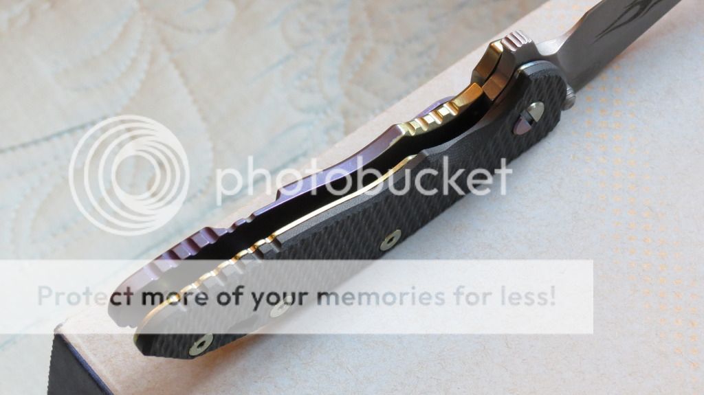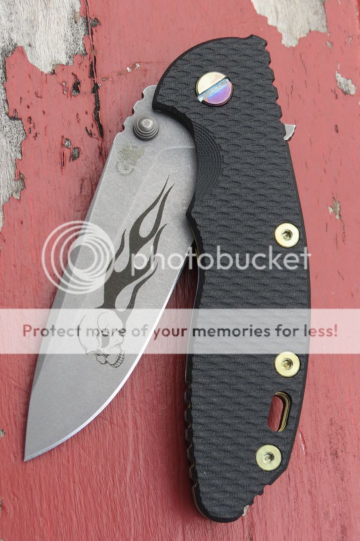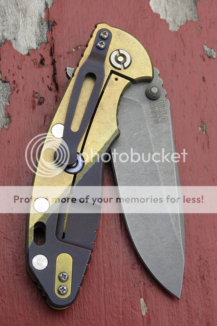Hinderer XM-18 3.5" Spearpoint with unique laser-etching on the working finish blade and two-tone ano on the frame. This is a one-off production knife DONE COMPLETELY BY HINDERER (yes, even the laser etching and ano). The ano is a deep purple and yellowish-gold. The liner, pivot screw, handle screws, and standoffs are anodized to match. I am first owner and have never altered it in any way. Safe queen, new in box. Centered, flips great, no issues to report. $405 OBO net shipped Paypal.