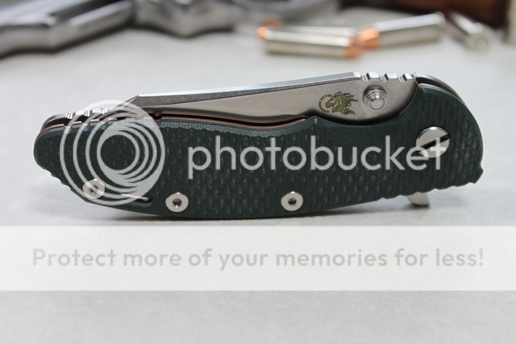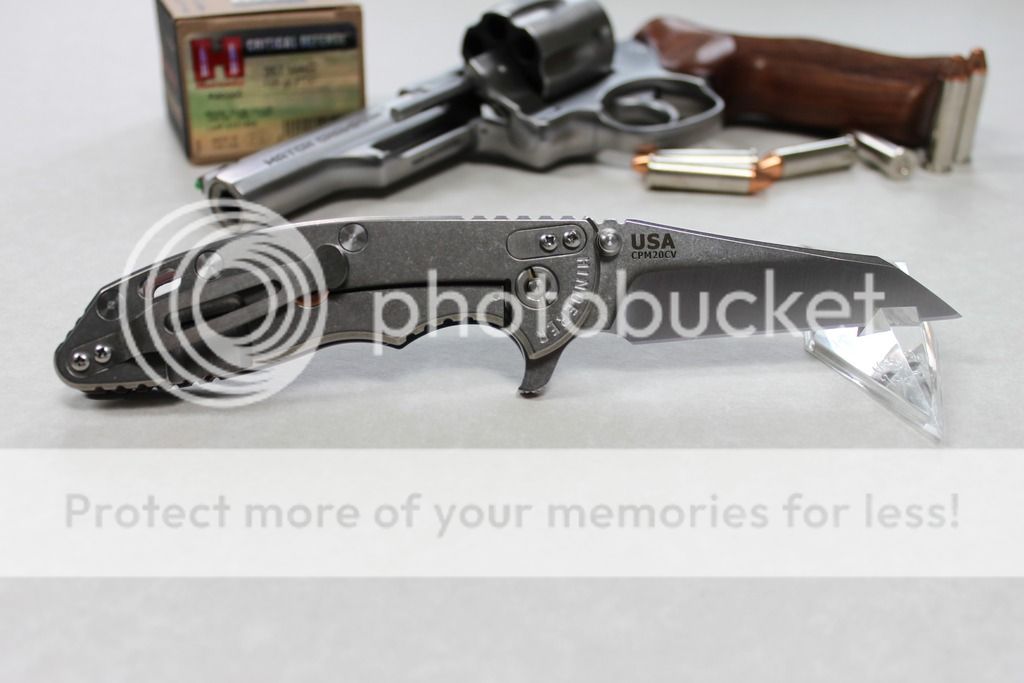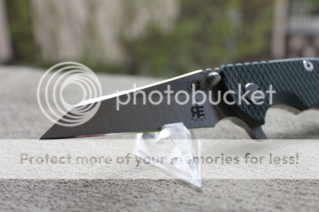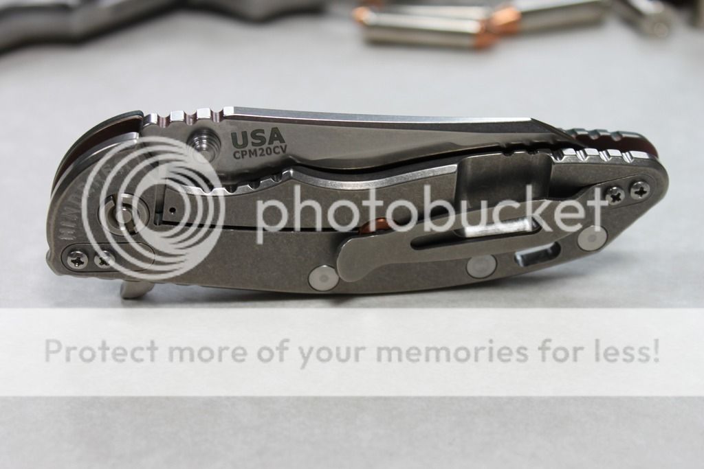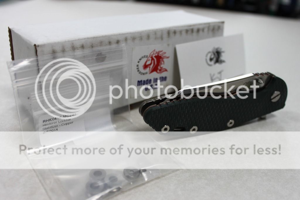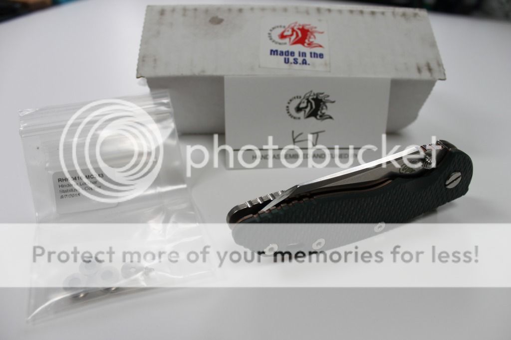 The knife was used extensively by it's first owner, and has some very faint scratches on the blade. Everything else is in top shape. The knife has had a regrind and bevel of 18DPS done by Josh at RazorEdgeKnives. Josh also anodized the Ti underneath the G10 to a really unique color. Looks bronze in the shade and almost a purple in the sunlight. Really sets the knife apart from others. The knife also has Copper Standoffs, and LBS from Monkey Edge. I also have the stock parts that were removed. As usual, the knife comes with everything it had from RHK....The Box, Card, Baggie, and tactical peanuts.