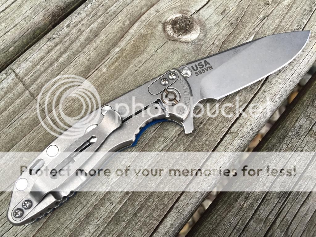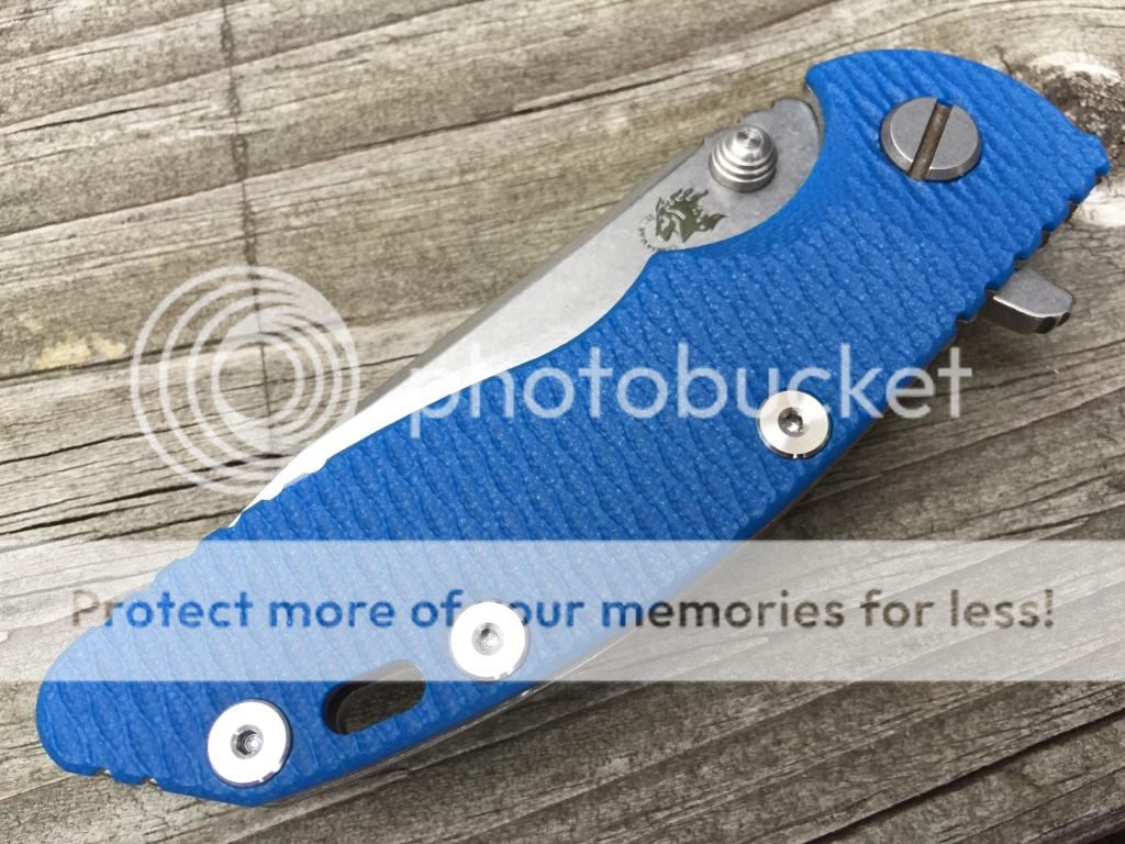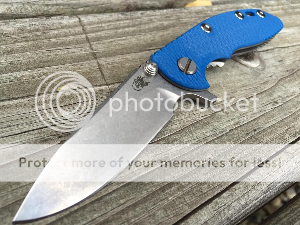 SOLD SOLD SOLD SOLD Hinderer 3" XM-18 with the slicer grind and blue scale. Just received this one yesterday and the knife is in brand new condition with box and all original packaging. The knife has a very snappy detent and the blade actually flips out very hard with either the flipper tab or thumb studs. The lock is early and blade is centered.