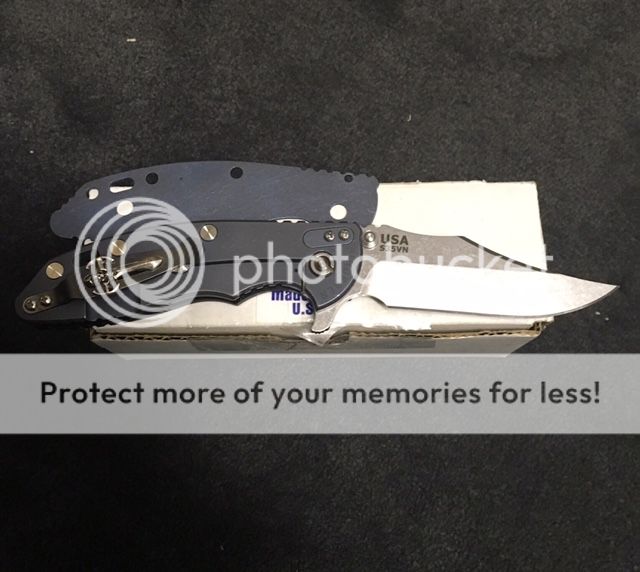 LNIB XM-18 Bowie Custom billet aluminum scale anodized black. The scale pattern is identical to the Hinderer titanium scale pattern. Battle blue lockside, I am also including the battle blue liner. Bronze pivot nut, scale screws and standoffs. Comes with battle blue pocket clip (not the one in the pic). Blade is flawless, never carried. Comes with original box. $old