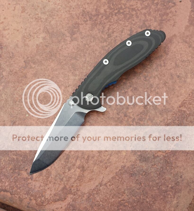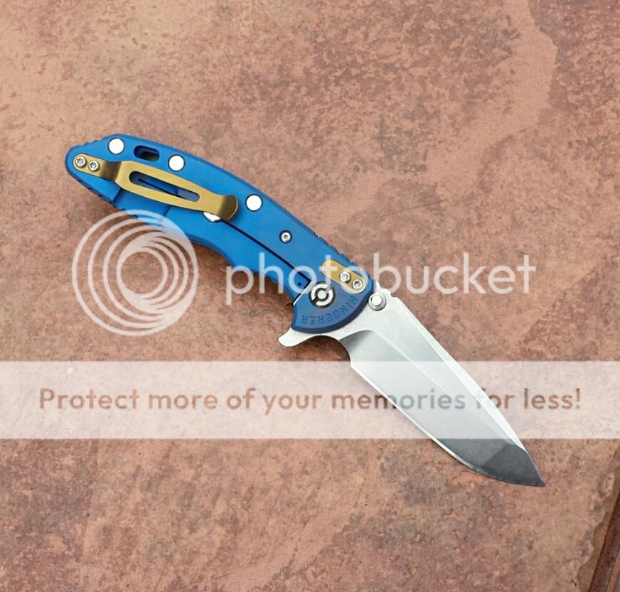 I have a Gen 3 Hinderer XM18 3.5. It is anodized blue and gold and has a unidirectional cf scale. Also has a detent mod so it flips nicely. All work done by me, used to make other scales but gave it a fresh coat of anodizing and the condition is great. Comes with a stock blue/green scale as well. The screws on the clip and tab were changed to t8 instead of philips.