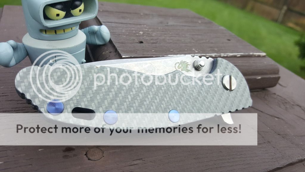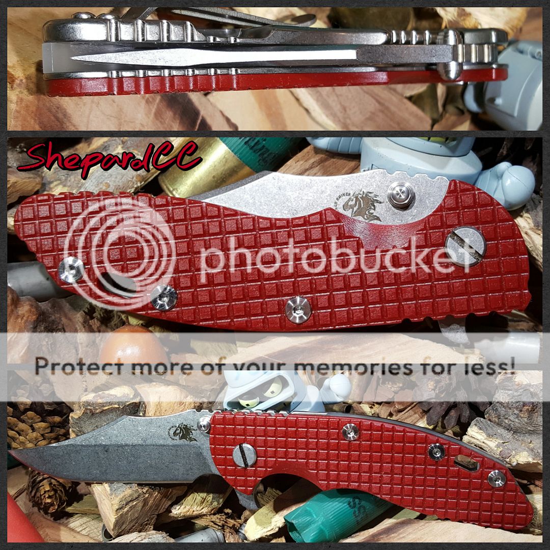 Comes with a Red G10 scale in a frag pattern that I made for it. Also come with a Carbon Fiber Backspacer I made for it . Stock standoffs included. Factory edge. Centered. Smooth.
