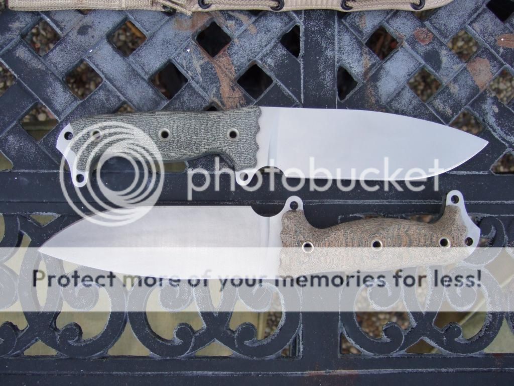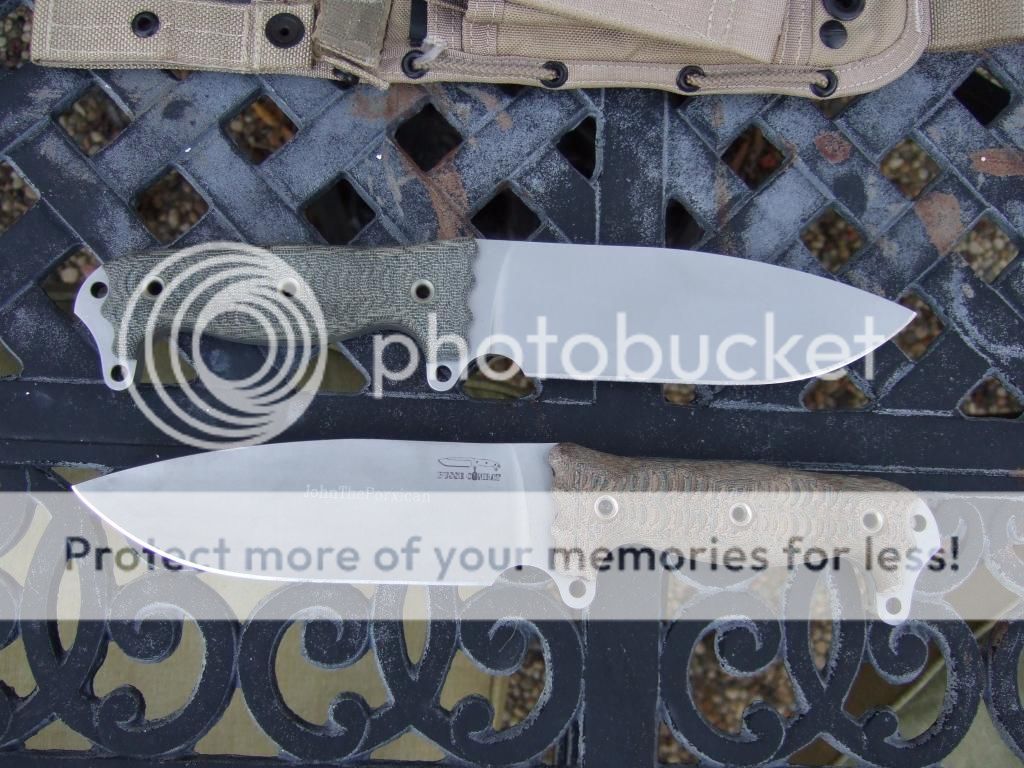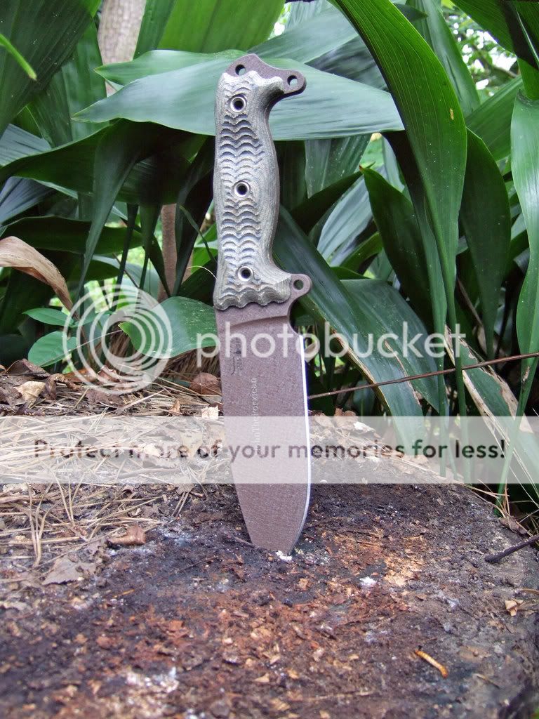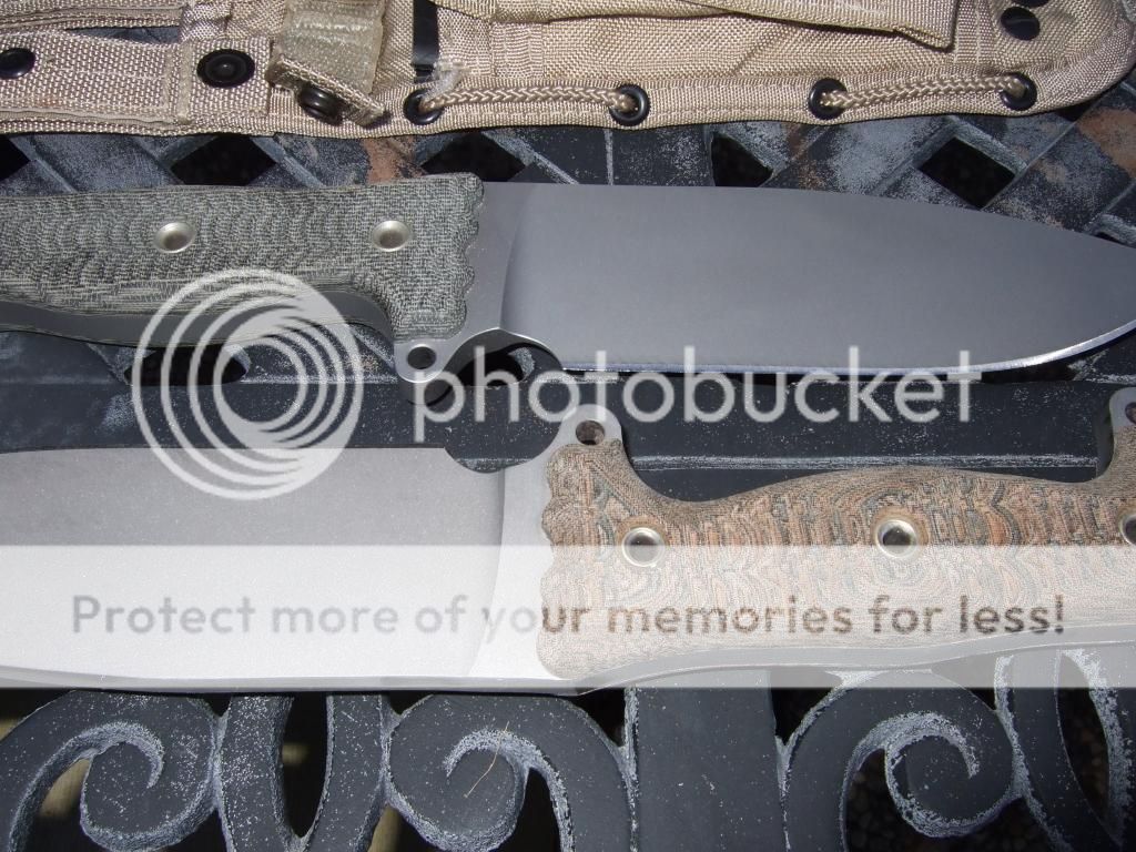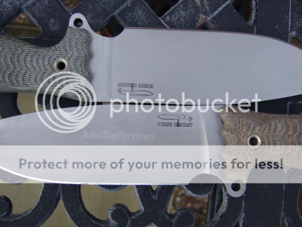 After a considerable amount of use and abuse, the muddy coating was getting sort of ratty looking around the edges (and chipped at the tip), and I thought I'd go ahead and strip it. I'd never tried stripping a knife before, but I figured that since this was the cheapest Busse I've ever bought, why not? My plan was to go whole-hog and give it the full satin treatment, but when the coating came off, this is what I found: