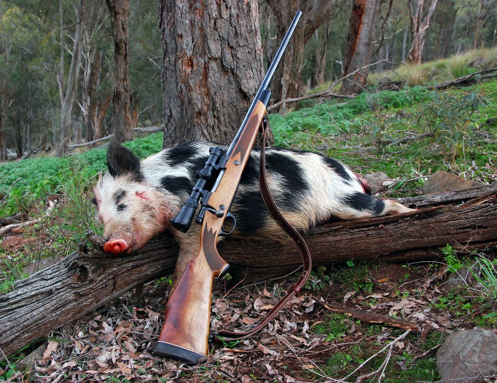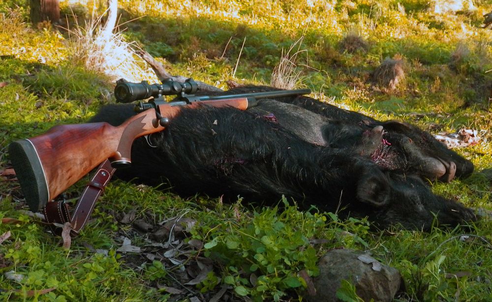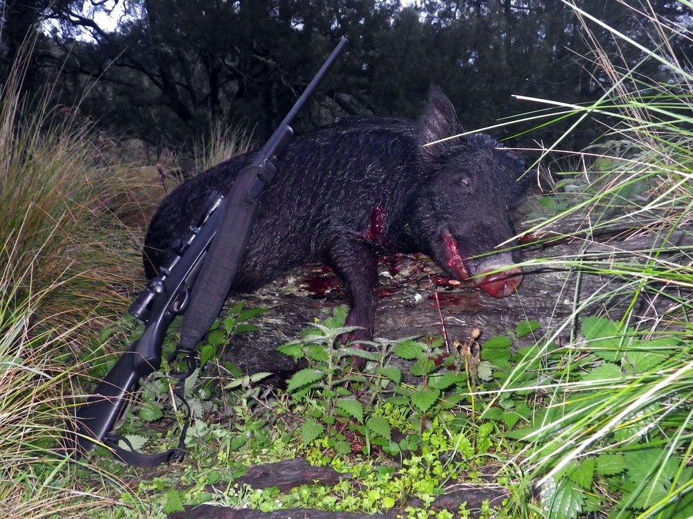 Now, this trip I decided to carry the .375H&H a little to make sure I was still comfortable with it and see how the loads worked (no pressure signs and shooting OK etc). I came off the mountain and got about 400 yds above a spot where I normally find hogs (down on the creek flats). So I walked down for a look around. Sure enough a lone boar was roaming around and after a bit of cat and mouse he lost...