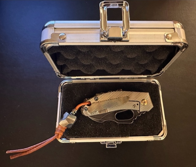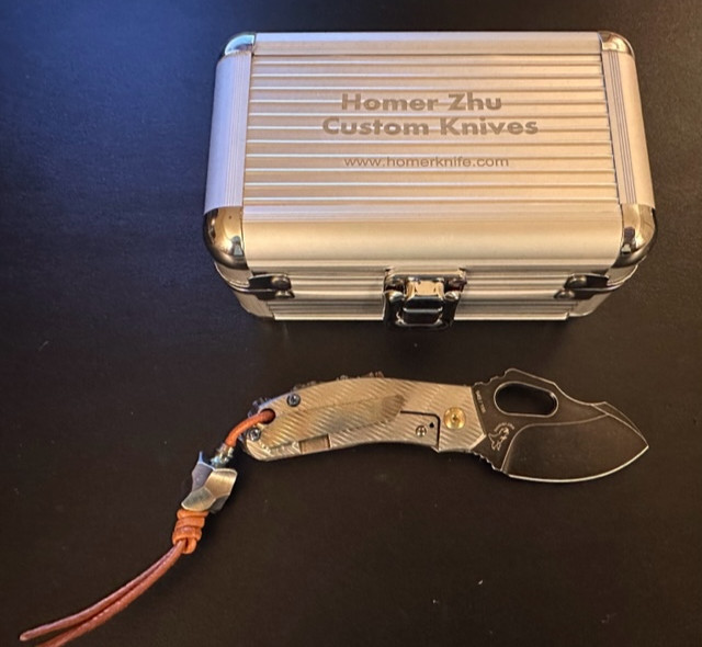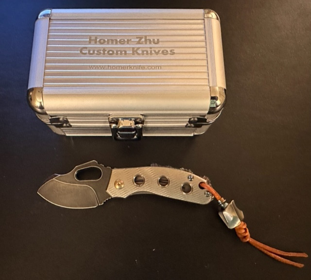Homer Zhu Custom T-Rex Folder Machined Titanium Body w/ Aggressive Rock Ground Back Spacer, Gold and Blue Hardware, and S35VN Black Washed Plain Edge Blade (2.5”) #42/198