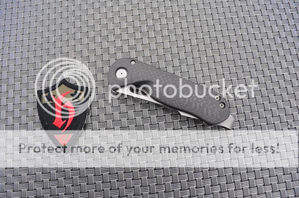 Horton Shawty with a carbon fiber presentation side and stonewashed titanium lock side. It has a 3.25" blade with a platinum edge. I got this folder from Jeremy at the Blade show, but it had no clip. Jeremy had drilled the holes full size by mistake instead of the smaller size to tap threads for a clip, I purchased it anyways. On this Shawty, I made the clip from a solid piece of .25" thick titanium and carved the clip out of it. I mounted it on the inside of the scale (it is tapped for the screws), it fits it perfectly. Jeremy like the clip and said "Some people can think out of the box". The patch is included with the sale. $2700, SOLD!