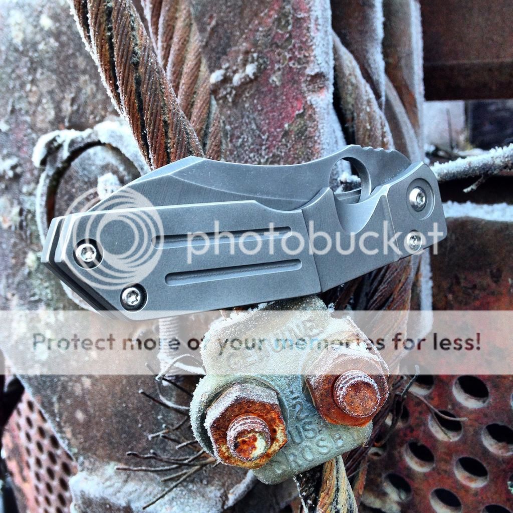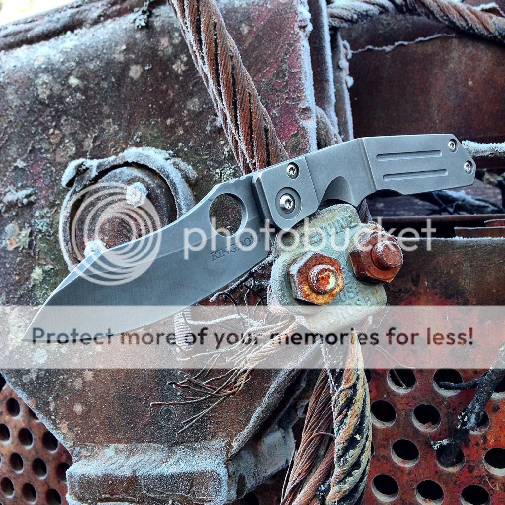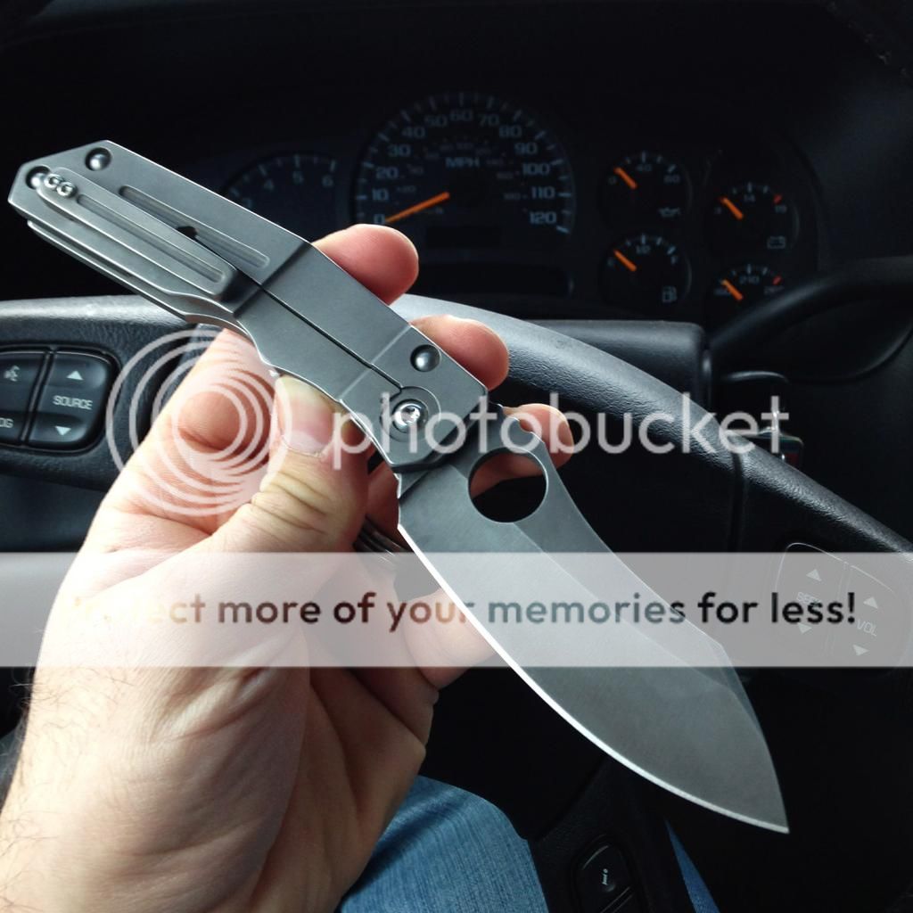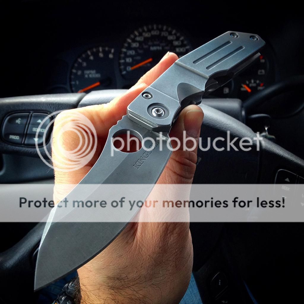 Fresh from the spa, lightly used Kingdom Armory Large Samaritan Custom. Only two like this and Daves books are closed as you know. This baby flips right open using the Spydie hole and has rock solid lockup. Blade is nice and sharp acid washed S30v. Blade is about 3.75 and total length is right at 8.75. Nice velcro pouch included. Has new clip on it now just made by Dave at KA. It goes into the pocket a little easier than the original clip (also included). As an extra bonus, Dave also installed an upgraded ti backspacer instead of the standoffs that it had originally.