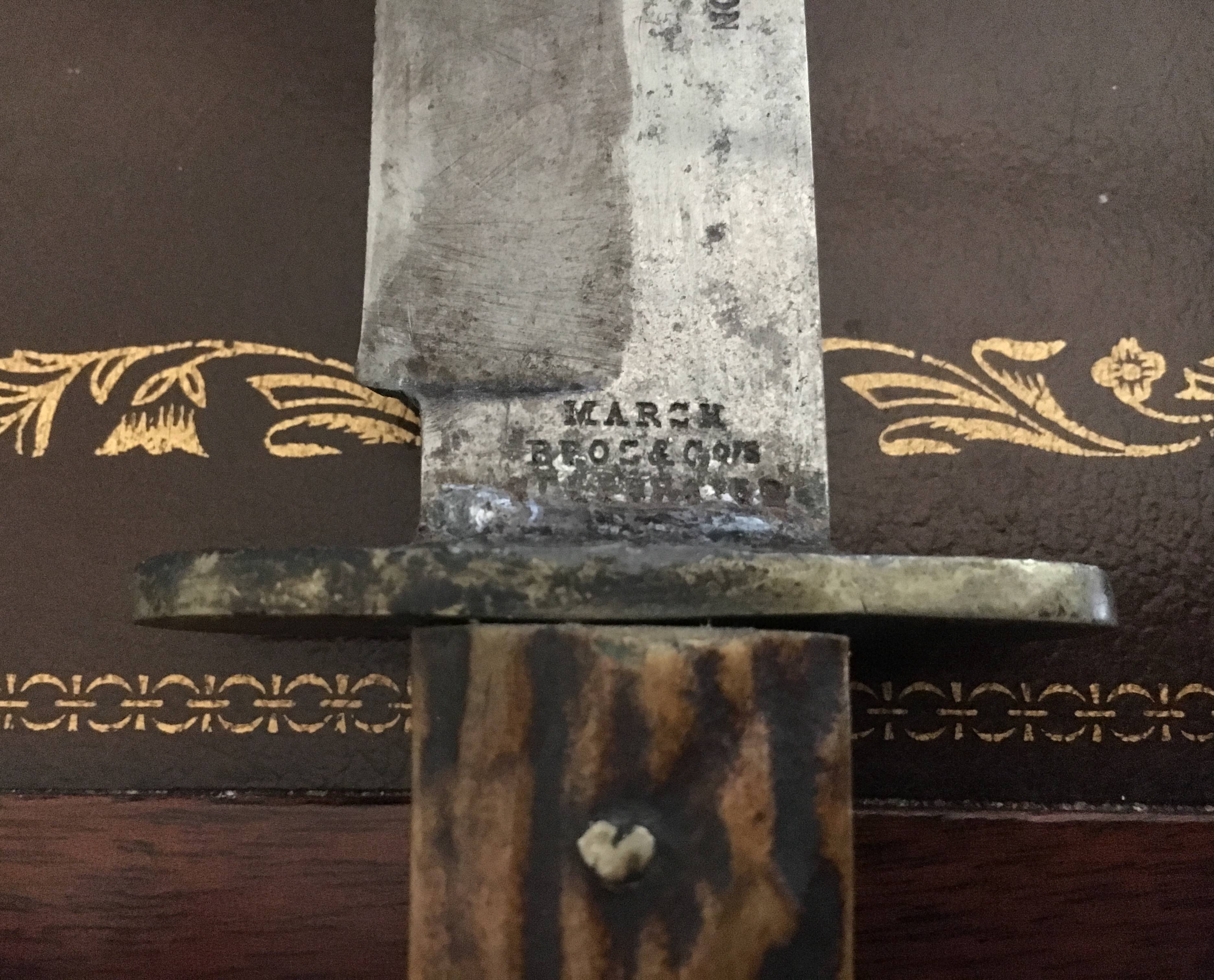 On the blade it has inscribed "The Hunters Companion" and right above the guard it it is marked with MARSH BROS & C o/s CELEBRATED". Originally I couldn't read the inscription and my post was going to be about helping to ID the knife (even with 2 pairs of reading glasses on I thought it said March instead of Marsh until I took a picture for this forum and zoomed in lol). If you see the picture it makes me wonder if they stamped the engraving on or how it got on because both of the "S" in Marsh and Bros is missing the middle section that makes me wonder if their die was chipped - kind of cool to think about. So now that I know who the maker is I'd love for some info on age and any history on the maker. I do not have a sheath for it.