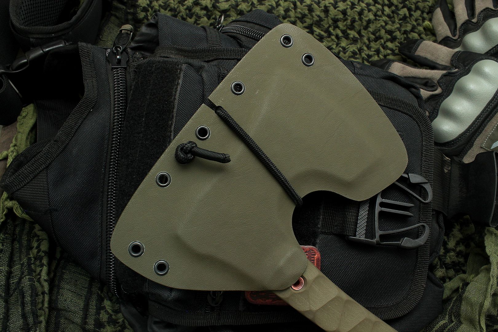 The sheath is designed to accommodate Molle loks or with a couple pieces of paracord, it can be carried with a sling underarm.