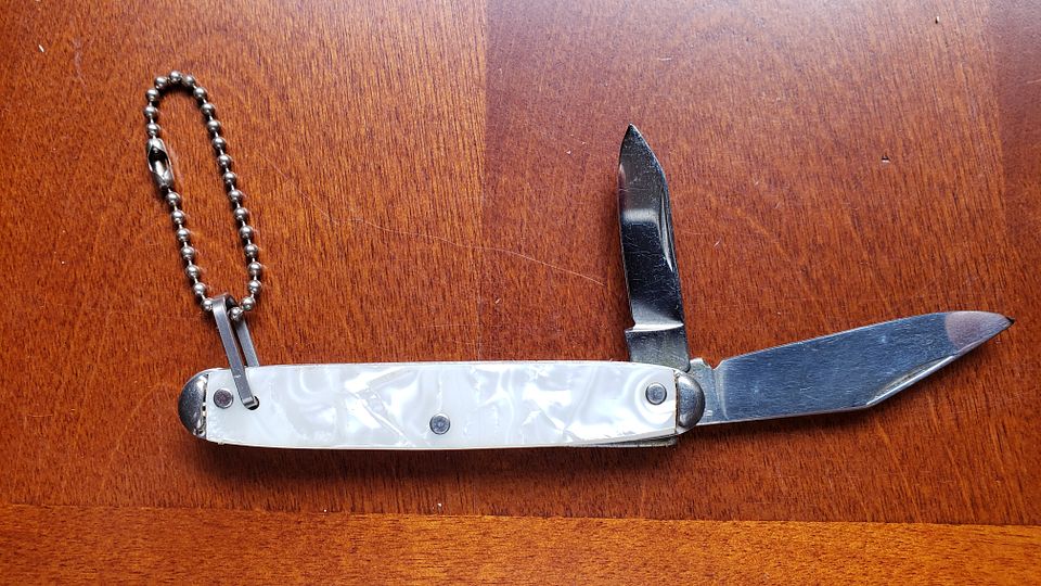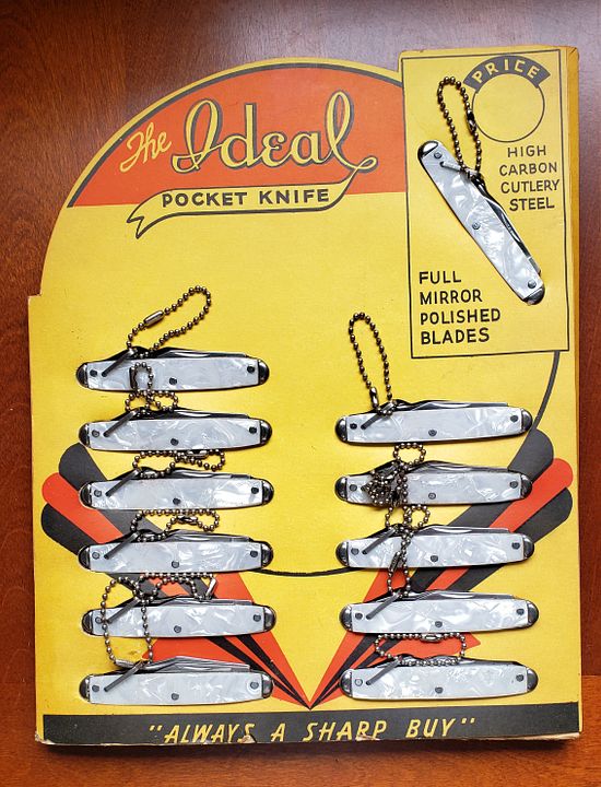 My Father had various different businesses in the 50's 60's and 70's This Ideal Pocket knife sales board was in a box of his stuff that I found after he passed away ten years ago. I'm sure he had it at one of his businesses. It's in excellent condition and is in it's original cardboard sleeve. The sleeve is marked "400PKC".