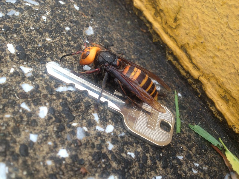 A few days ago, I was walking my son to school. We saw this giant hornet on the side of the road. I took a picture of it, while it was still barely alive, next to my house key.