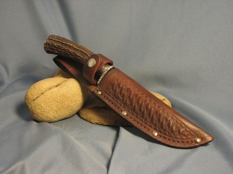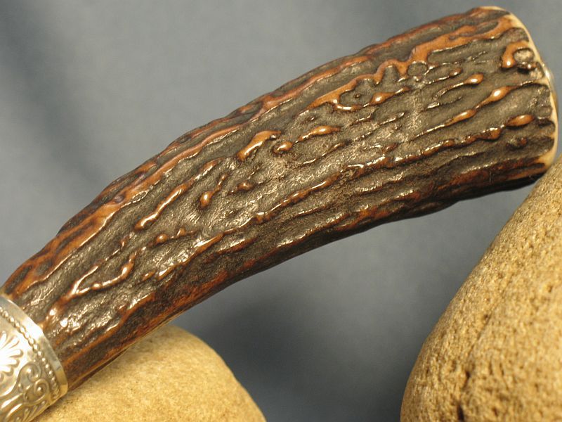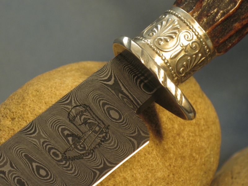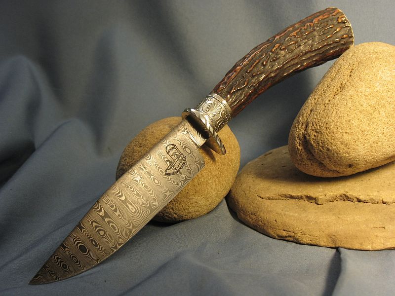 Here is a neat one that I just completed. Guard and buttcap are nickel silver and ferrule is sterling silver with a fine cut of stag that is good for right or left hand. Well balanced. I made the Ladder pattern Damascus for a order and had some left over. 1080 and 15n20 steel. Blade length is 4 3/4 inches and overall length is 9 3/8 inches. Comes with sheath. Knife is "SOLD" and 6.00 for mail in USA address. My paypal is dangraves4923@earthlink.net