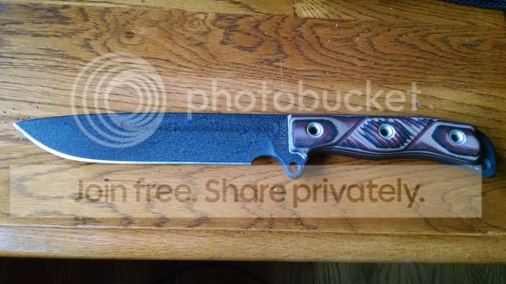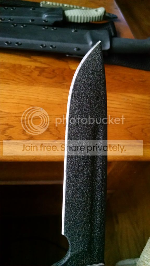 I believe this knife has been sharpened a little and possible used very little. No wear on the coating at all. There are some handling marks in the coating near the tang. See pic