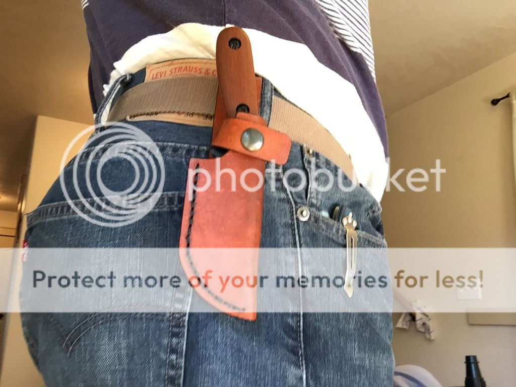 The knife is held in place well and the sheath rides on your belt so well you dont even notice it. The craftsmanship is top notch. Ive been wearing it where I can for a few weeks now and it has really been handy easy to take deploy the knife and to put it back one handed. Very secure, and a very noticeable snap when you secure it. I also like snaps on my leather sheaths and this really fit the bill well for me. He does make the sheath to order, so it takes a few weeks to get it, but worth it! On to the pics!