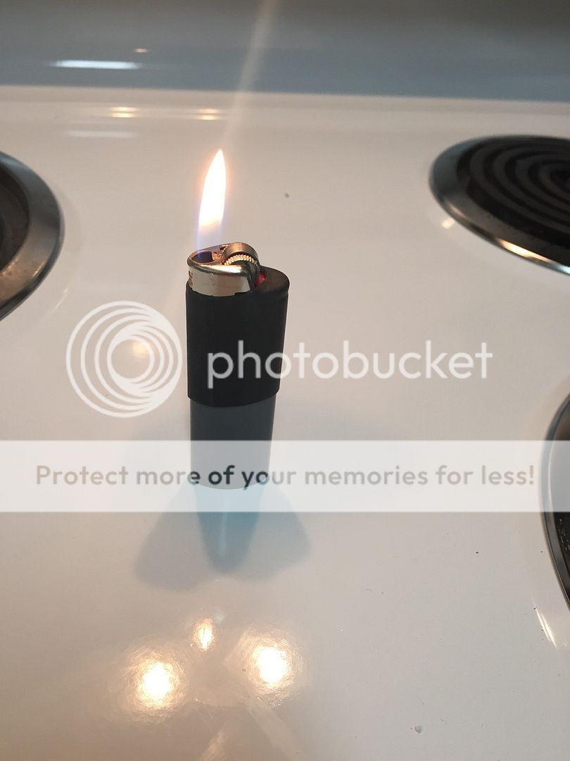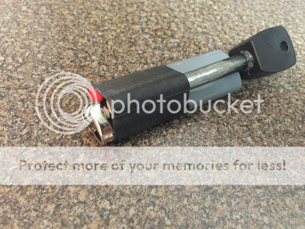 This one is a simple one that i like to refer to as "Reliable fire", you get a few things all at once with this, the obvious bic lighter and a ferro rod, you get a little backup tinder by using the inner tube and the lighter, and it works as a lock for the lighter, with the tube blocking the lighter button, it cant leak out if accidentally pressed in a pocket or pack, and when you want to use the lighter, you can use this trick: