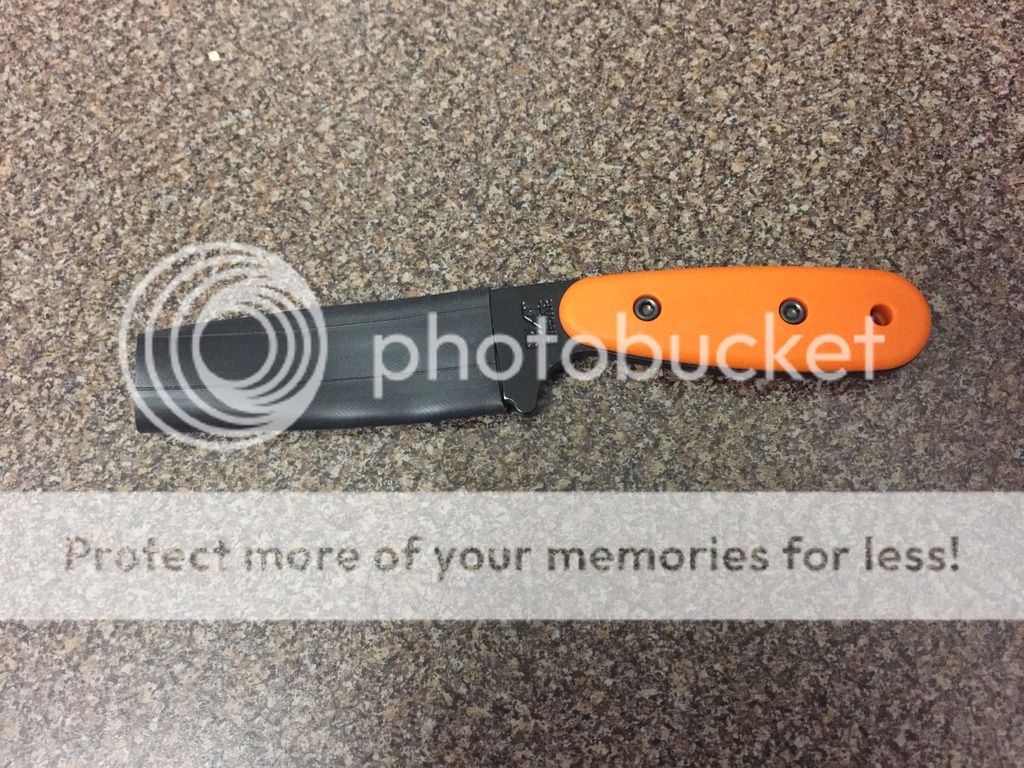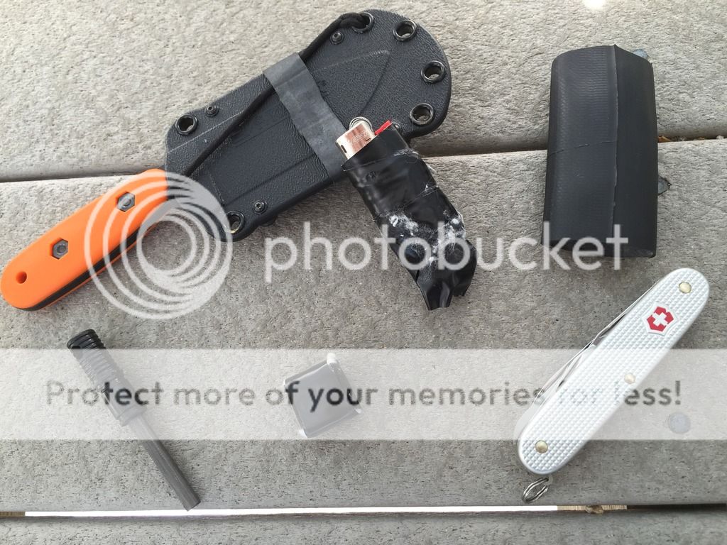 so here you can see the contents of what i was able to fit on the sheath of my bk14 - a SAK farmer, ferro rod, the little black square is a cotton ball with vasceline wrapped in electrical tape to keep things clean, and the lighter is wrapped with about 50ft of fishing line, and has a few small hooks as well, all of which is then wrapped up in electrical tape to keep it from going everywhere and uncoiling