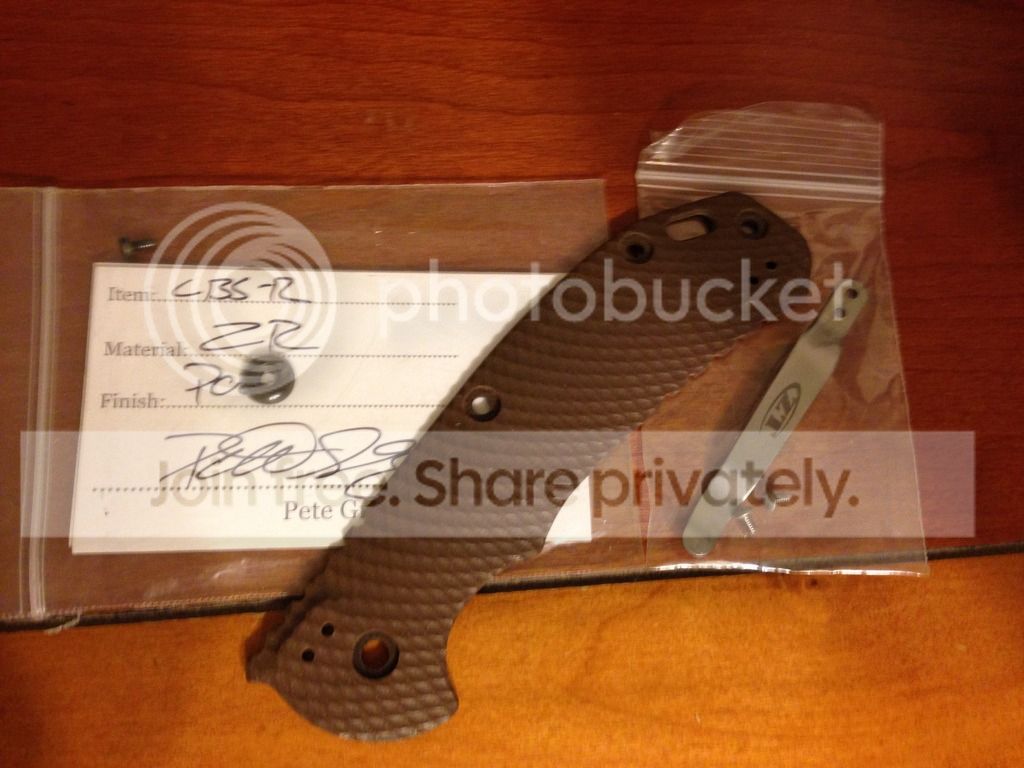 You get a "stock" tan g10 scale off a zt0561 , a zirc lock bar stabilizer (Pete gray), and a zt0808 pocket clip that's more like an xm18 style. For those who don't like the deep carry as much or just want something different. pics suck- I'm sorry- but everything looks brand new! Not a mark on the scale, lbs or pocket clip. G10 looks darker in the pic then it is. I'm sure you all know what a zt0561 scale looks like.