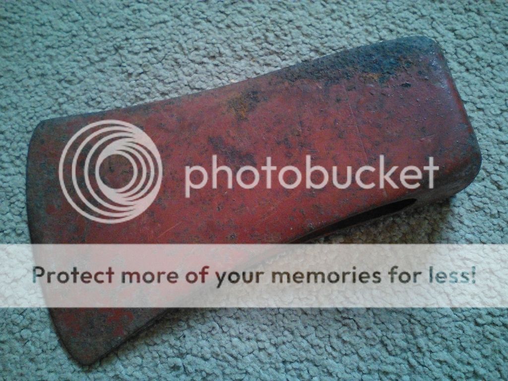 It got shipped to me home and much quicker than expected. Yeah, I purchased this off that auction site for $20 + $6 shipping and I wasn't even drunk. Its not normal for me to spend so much on an axe head but I figured $26 for an 8" long red axe head that I could just make out the words True Temper Flint Edge Kelly Works under the red paint was worth the $$$. It looked like a rafting axe from the photos on the site but the round egdes on the poll had me wondering. I was encouraged by the untouched looks of the bit.