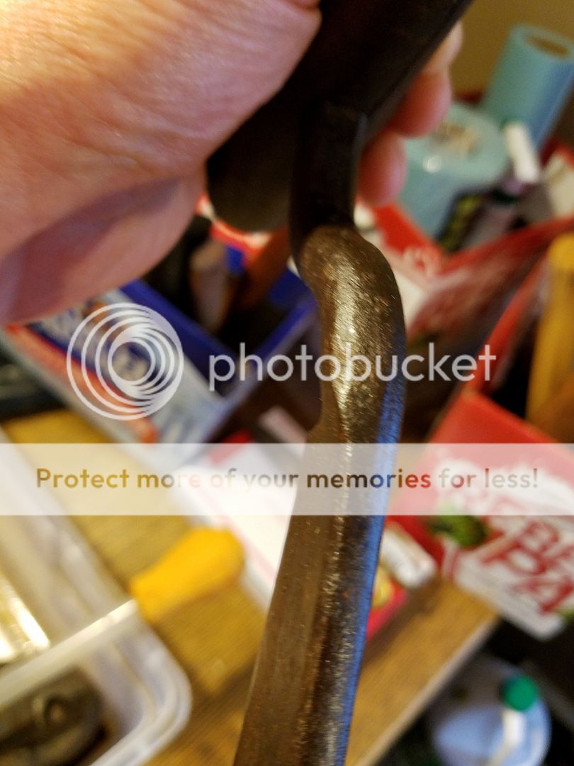 That surprises me. It sure looks like somebody forge welded a piece of rod to a piece of high carbon flat stock. I just can't see any blacksmith forging that out of one piece of steel and leaving that big bead on the back of the knife. Huge amount of detail work to do that for no apparent gain. And he took the easy way out on the handles, just poking straight thru and peening over the end. I don't think any smith would go out of his way to leave that high bead on the back and then go so quick & dirty on the handles.