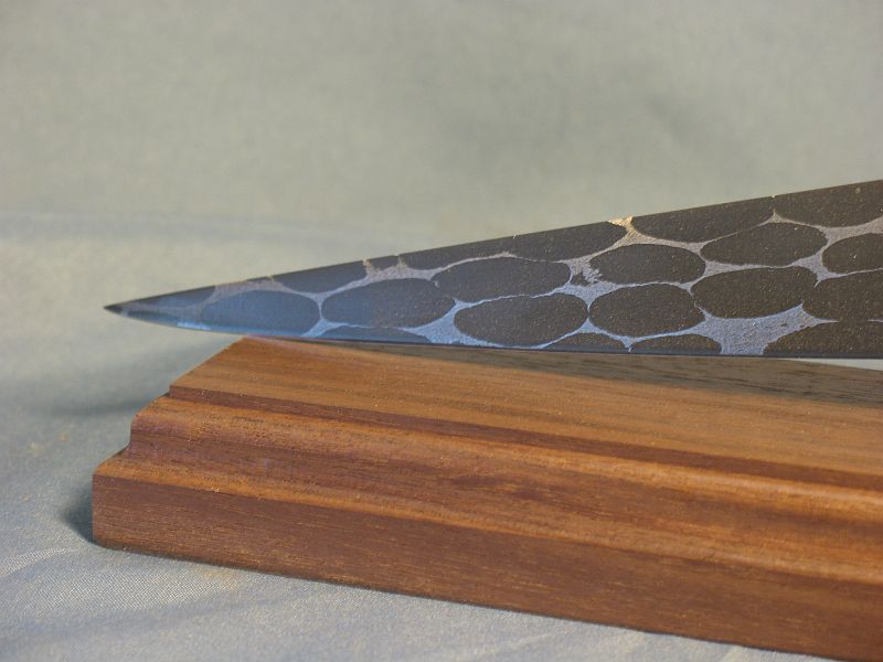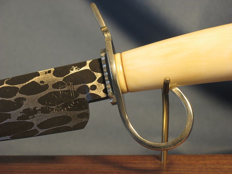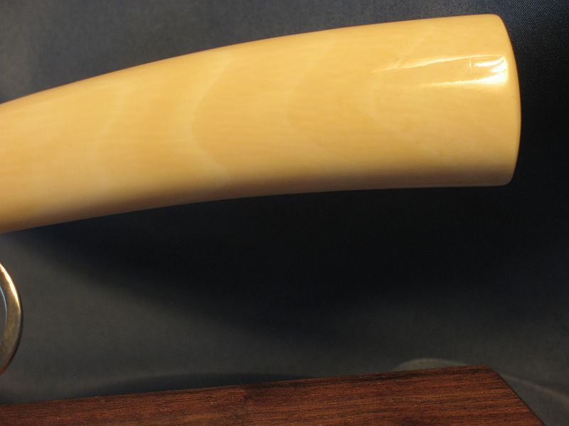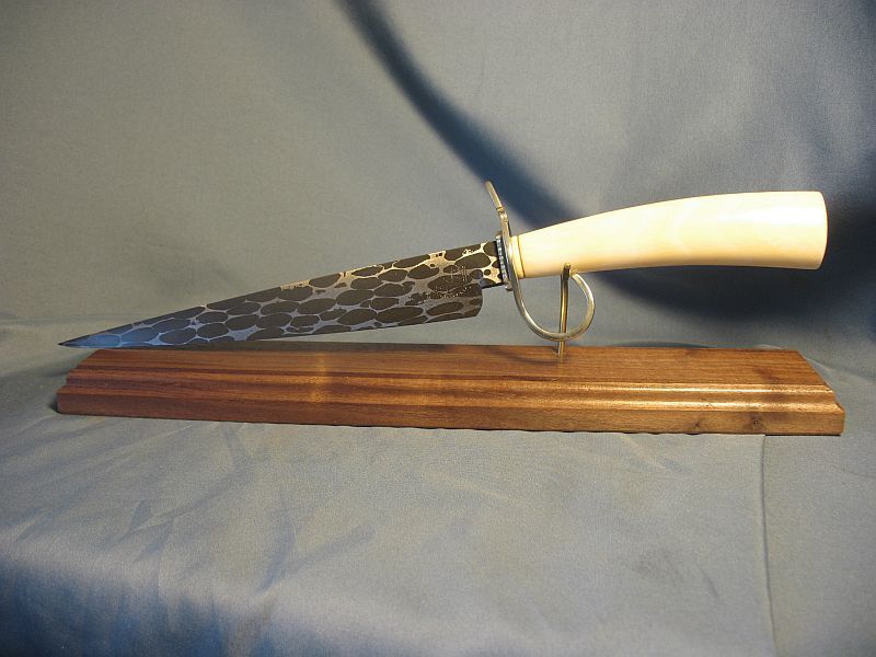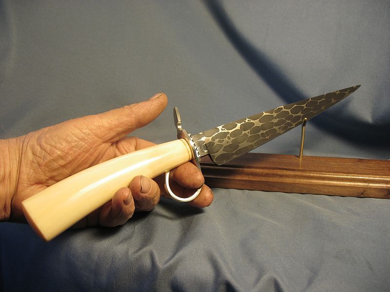 Wicked ring guard fighter. Has a hell of a distal taper to tip. The handle is an incredible cut of pre-ban ivory with lots of grain. Tried to get it in pictures but does not do it justice. It has an 8 3/4 inch blade and 14 1/8 inch overall and 1/4 inch thick at riccasso and tapers to tip. Comes with Black walnut stand. Will let the pictures tell the rest. It is "sold" with 12.00 mail.