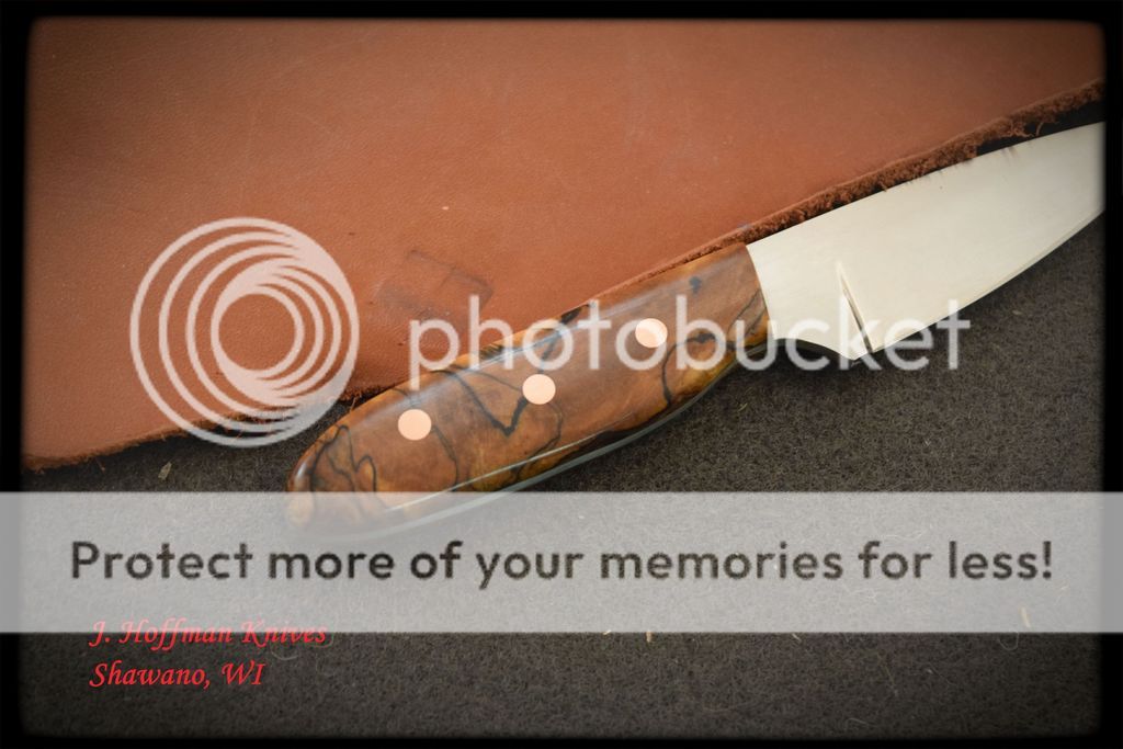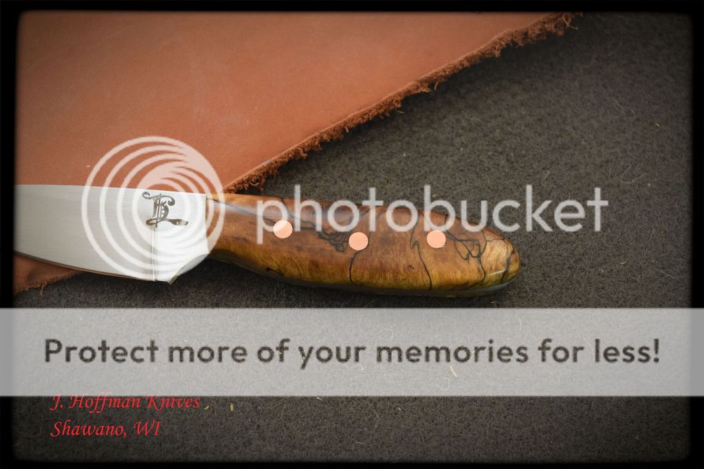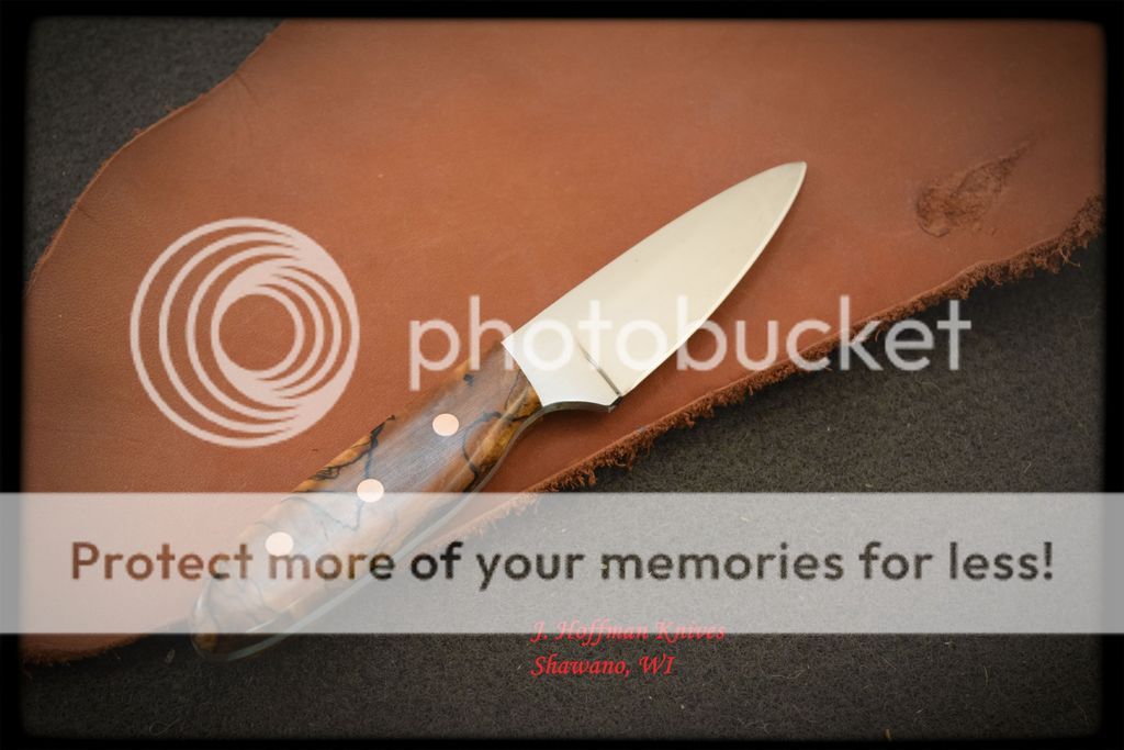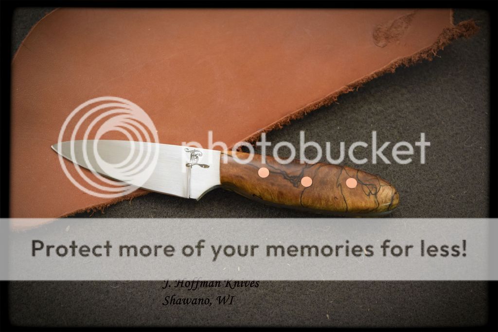 This is a small EDC or neck knife. The blade steel is 1/8" AEB-L. The handle is stabilized spalted Birch burl from northern Wisconsin. The wood was professionally stabilized by WSSI. The handle has beautiful figure. I did make a mistake when placing the pins, and they are a little out of line. The blade has an 800 grit satin finish. This one does not include a sheath. I'll pay shipping. I take CC (Preferred), PP or money order. If you have any questions, please let me know.