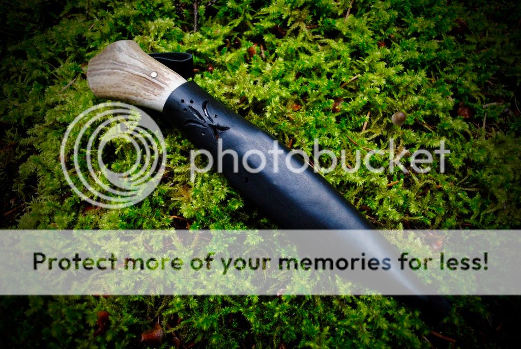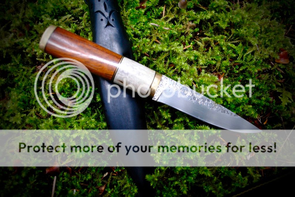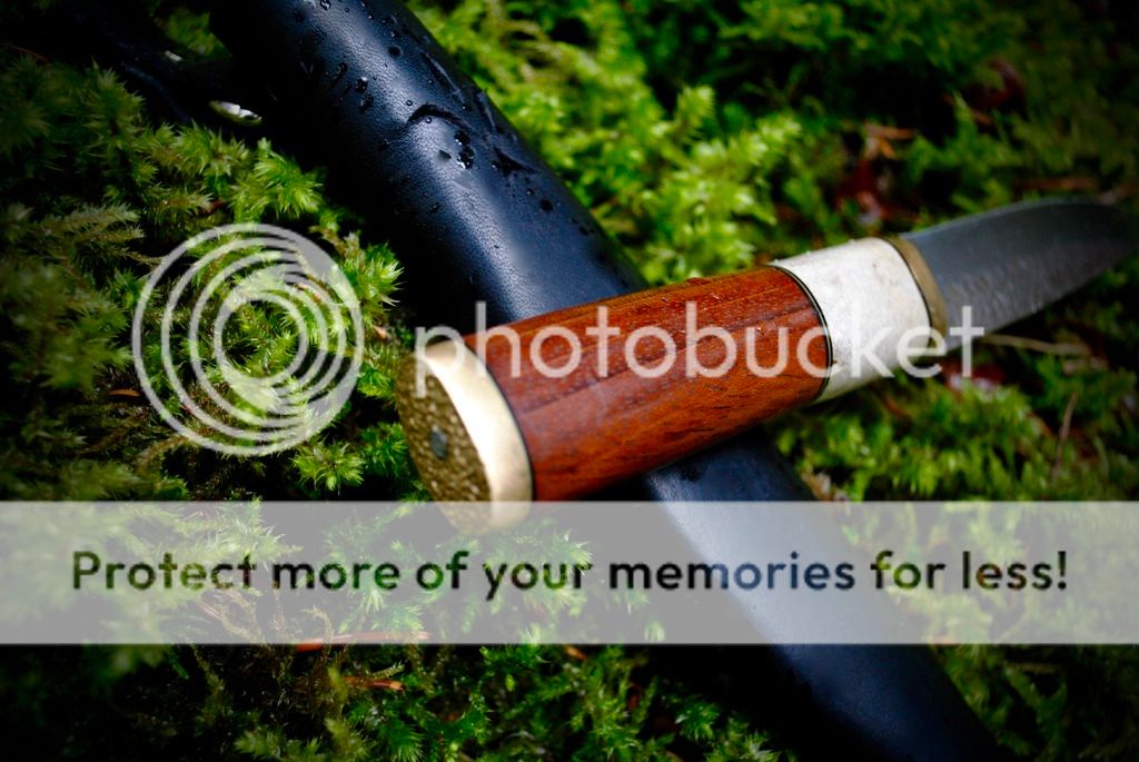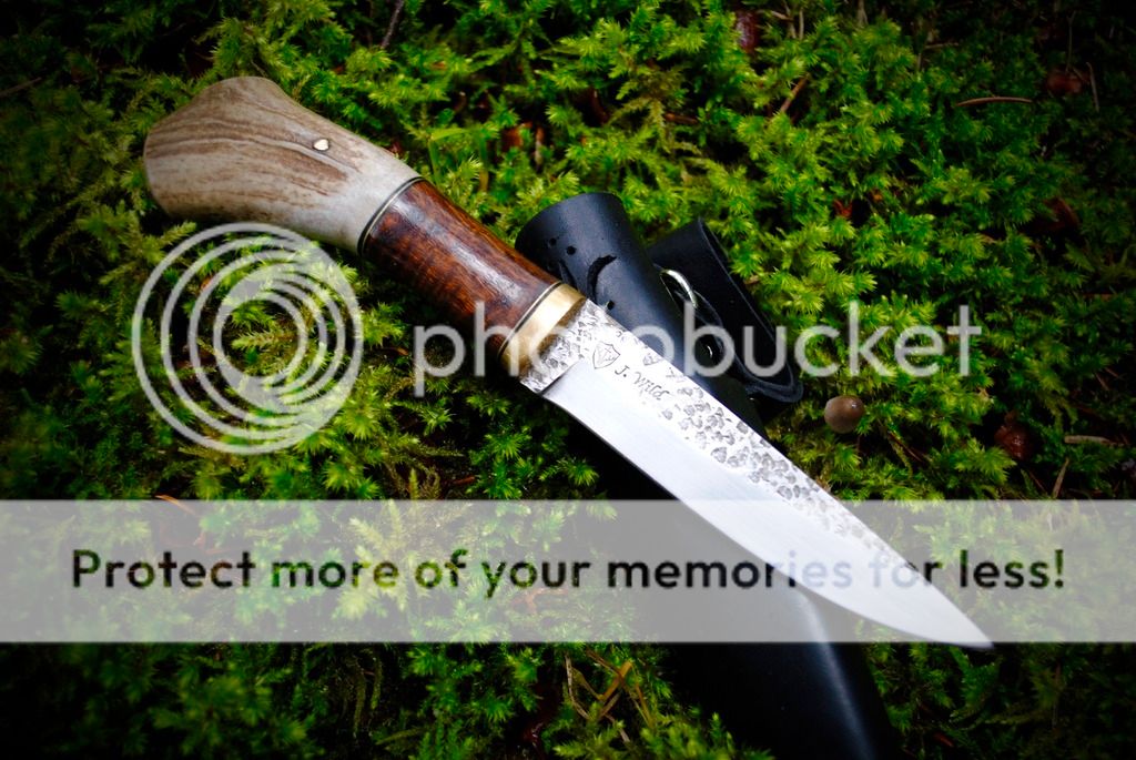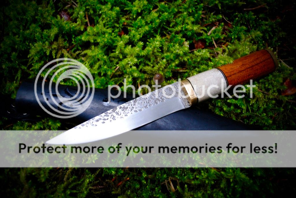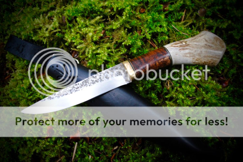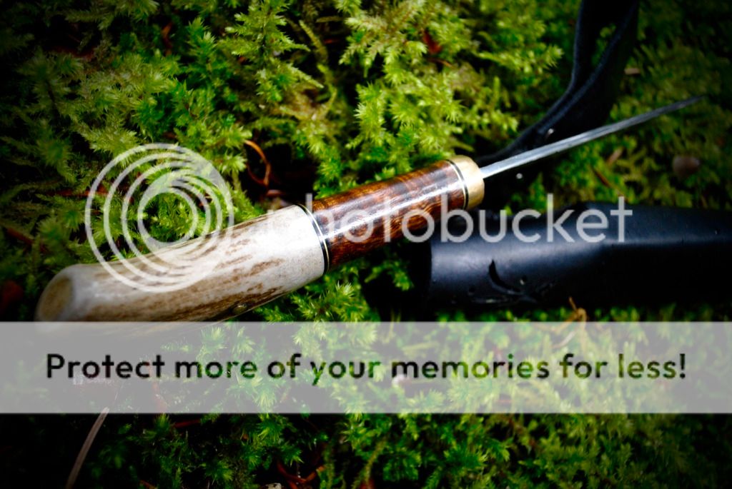 #1 Is a cherry wood and antler handle traditional style puukko. The tang of this knife goes all the way through and ends in a bolt that is threaded into the brass pommel. This method of handle attachment is very strong and second only to a full tang knife.