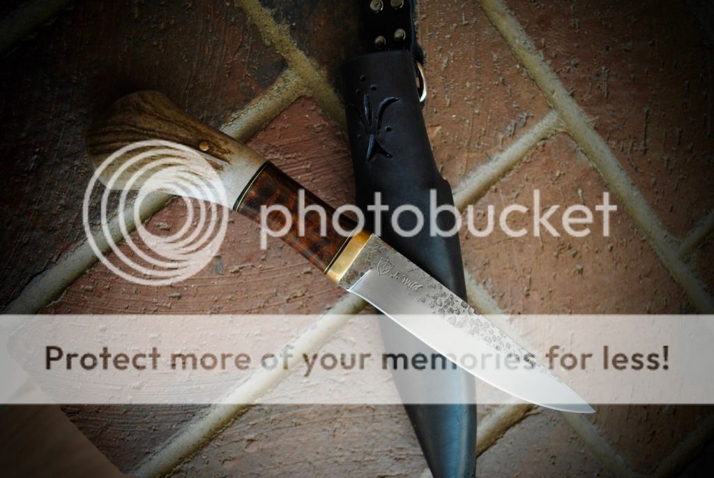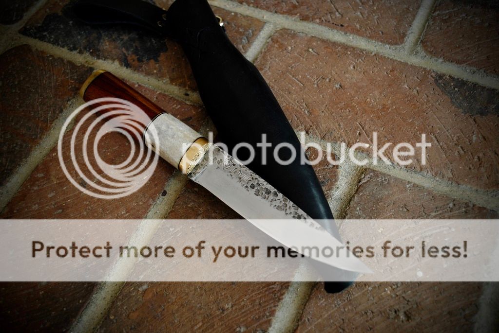 #1 Is a cherry wood and antler handle traditional style puukko. The tang of this knife goes all the way through and ends in a bolt that is threaded into the brass pommel. This method of handle attachment is very strong and second only to a full tang knife.