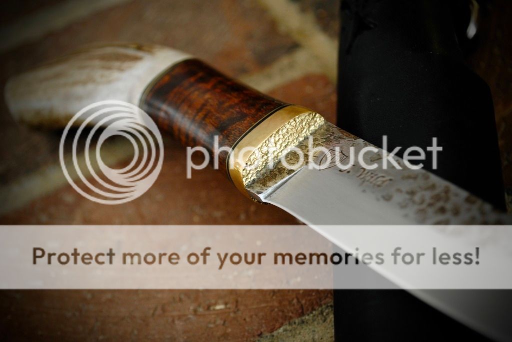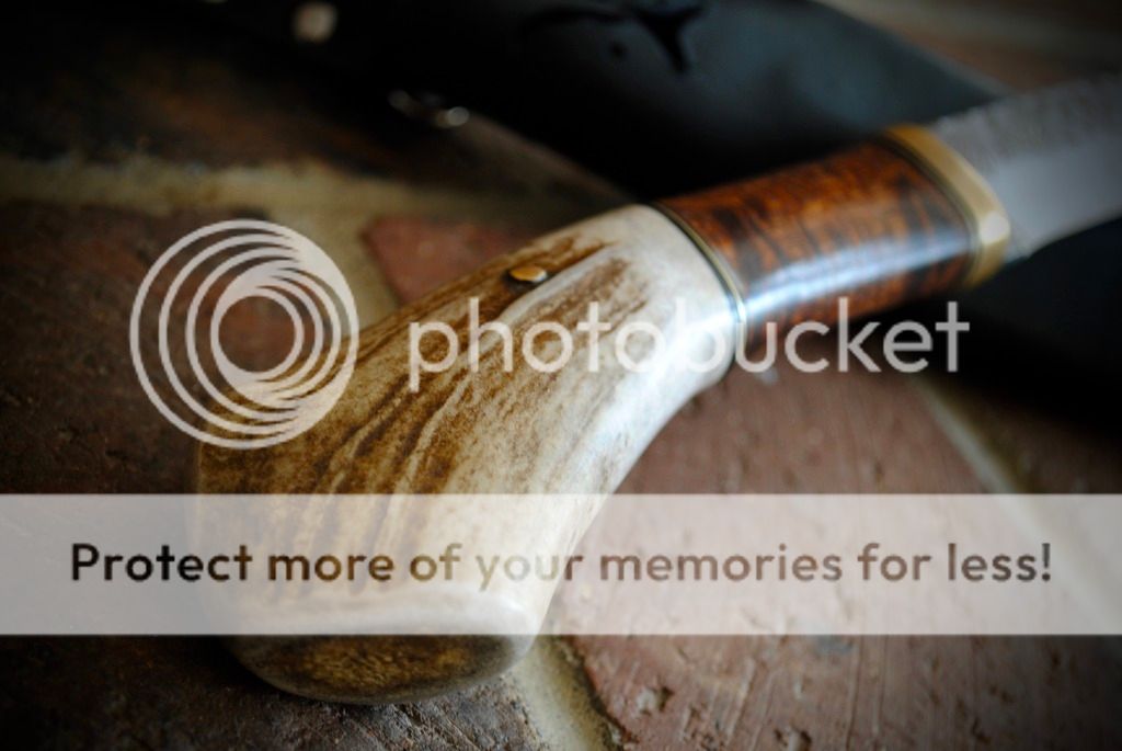 #2 Is a unique antler handled/ Hawaiian koa puuko The handle on this knife is made from the same antler as used in knife #1. I left the antler on the long side, and am quite pleased with how it feels in the hand. The wide part of the antler keeps this knife from feeling like it will slide out of your hand.
