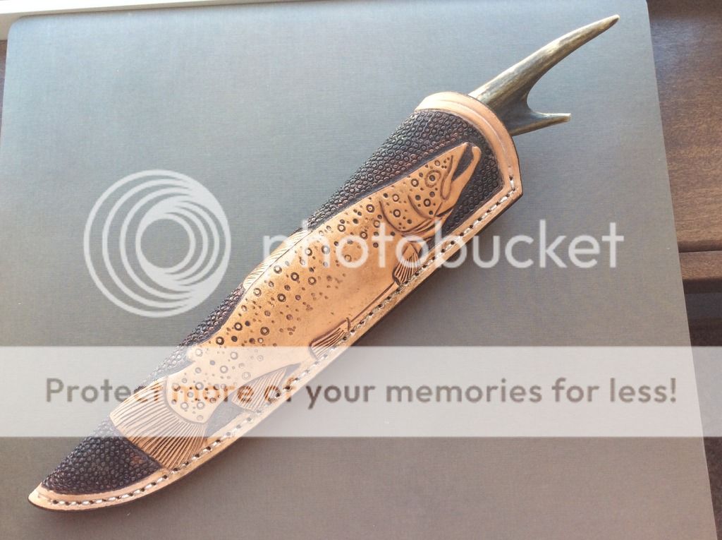 James Behring Jr. Large Bird & Trout. Total safe queen, unused, uncarried. 5 3/4" forged carbon blade. 11 7/8" OAL. Handle is stacked horsehide, micarta and aluminum with a fishtail antler. Comes with nicely decorated Mudbone sheath. This hurts to sell but surgery bills have arrived.