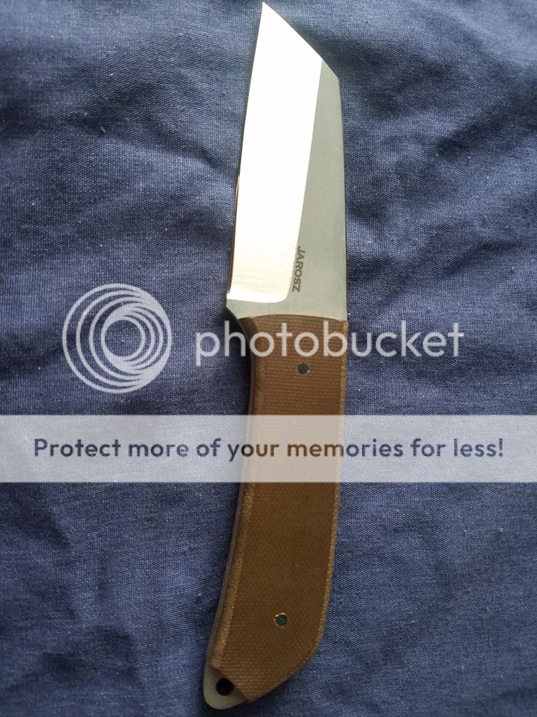 First up is Jesse Jarosz fixed blade in AEB-L with brown micarta handles. There is no sheath but does come with a certificate. Price is $115.