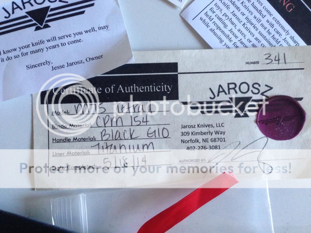 It comes with the COA(certificate of authenticity) from Jesse with all the other stuff it came with. This is a great knife and I wish I could keep it, but as we all know I have over spent, haha!
