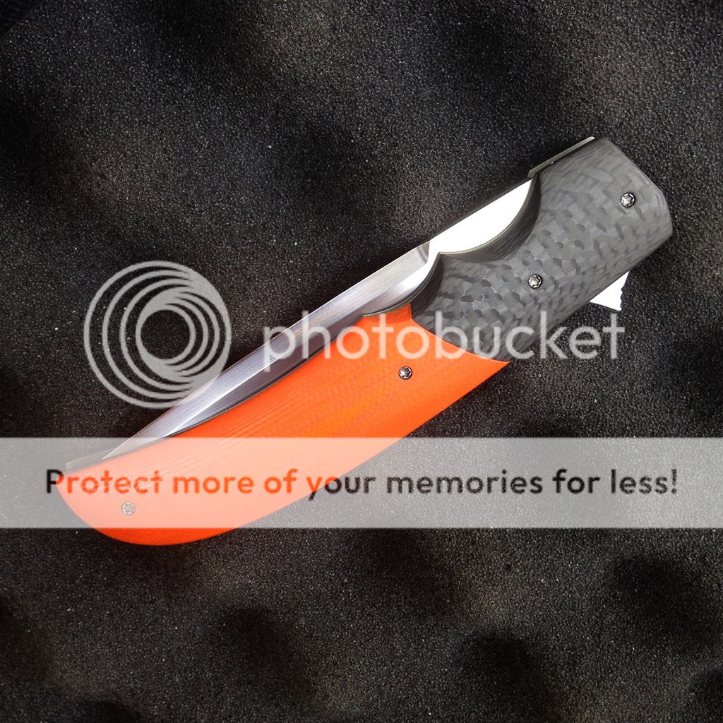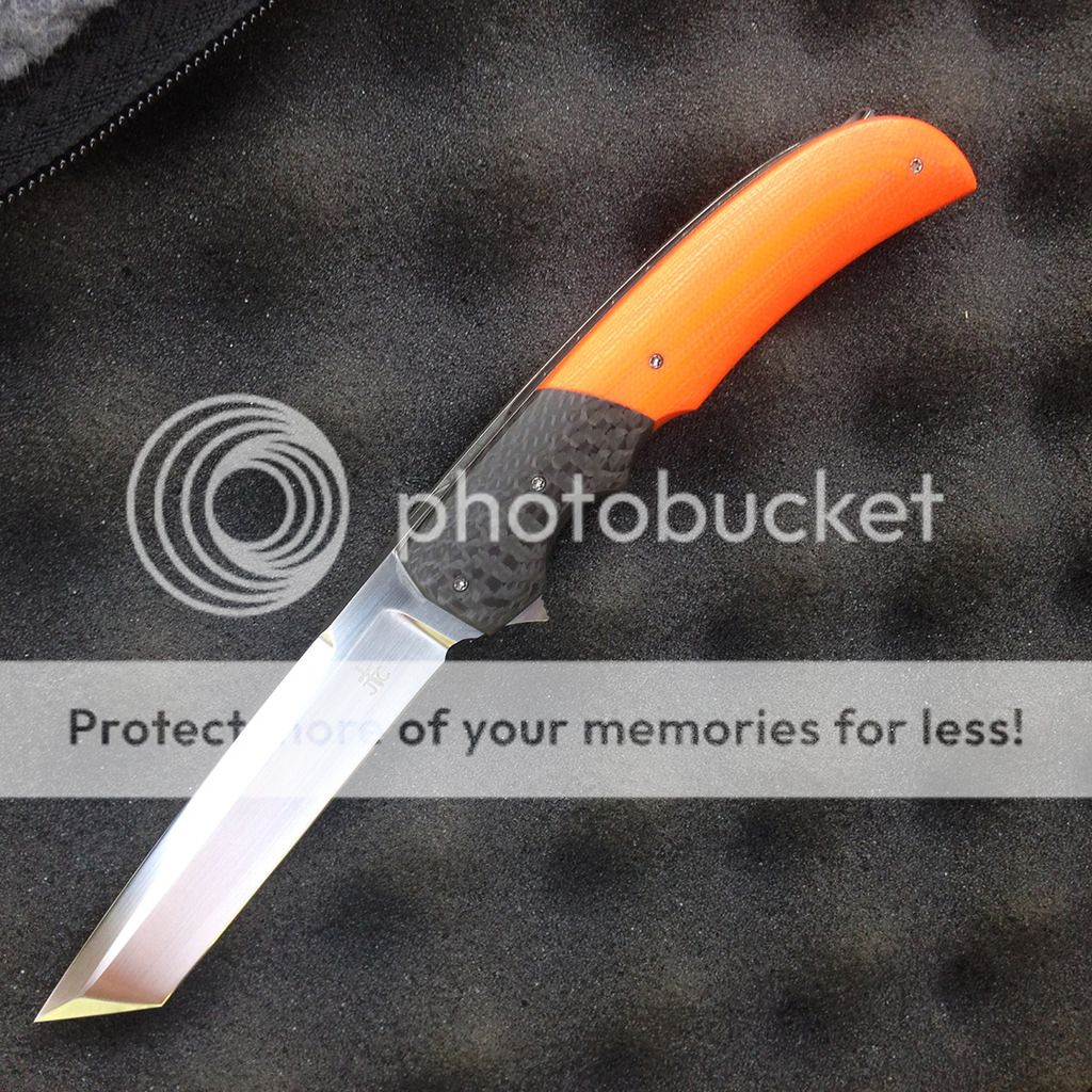 This hand-made Tanto flipper from Jason Clark is a smooth, precise folder with great looks and action. The handle is built with a framelock back and contoured carbon fiber bolster and orange G10 scale over a titanium liner. The fileworked back spacer is stainless steel. The blade is hand satin rubbed CPM-154 steel and opens with ease thanks to the IKBS bearing system. This Jason Clark folder is an excellent choice for everyday carry and comes with a tip-up carry titanium pocket clip. Super smooth flipping action. Solid early lockup. No play in any direction.