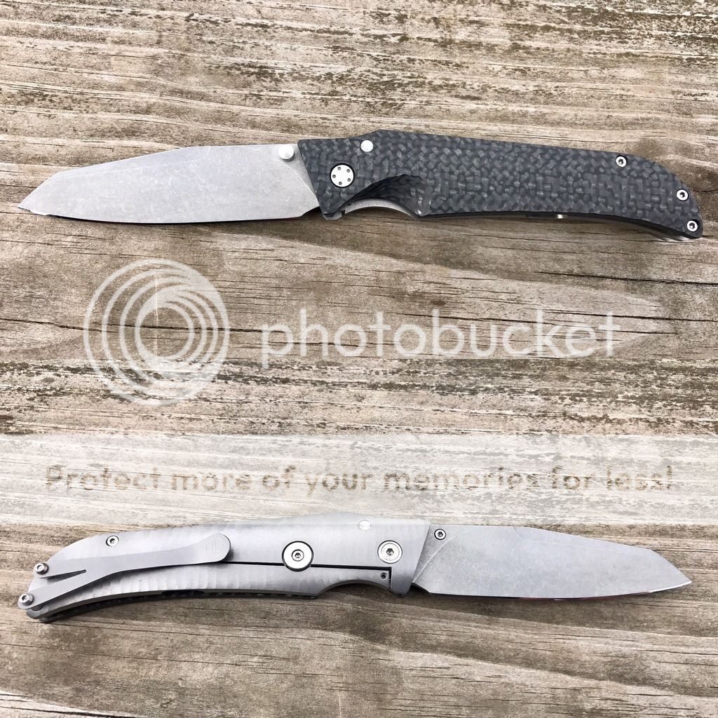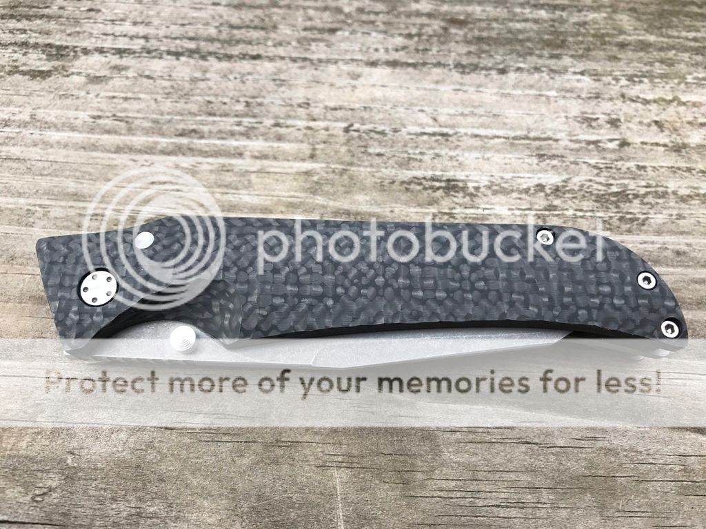 This is a very unique knife. It's got a milled carbon fiber show scale and a milled titanium lock scale. The blade has been given a "working stonewash" finish and was sharpened by Josh at Razor Edge Knives. Centering and lockup are perfect.