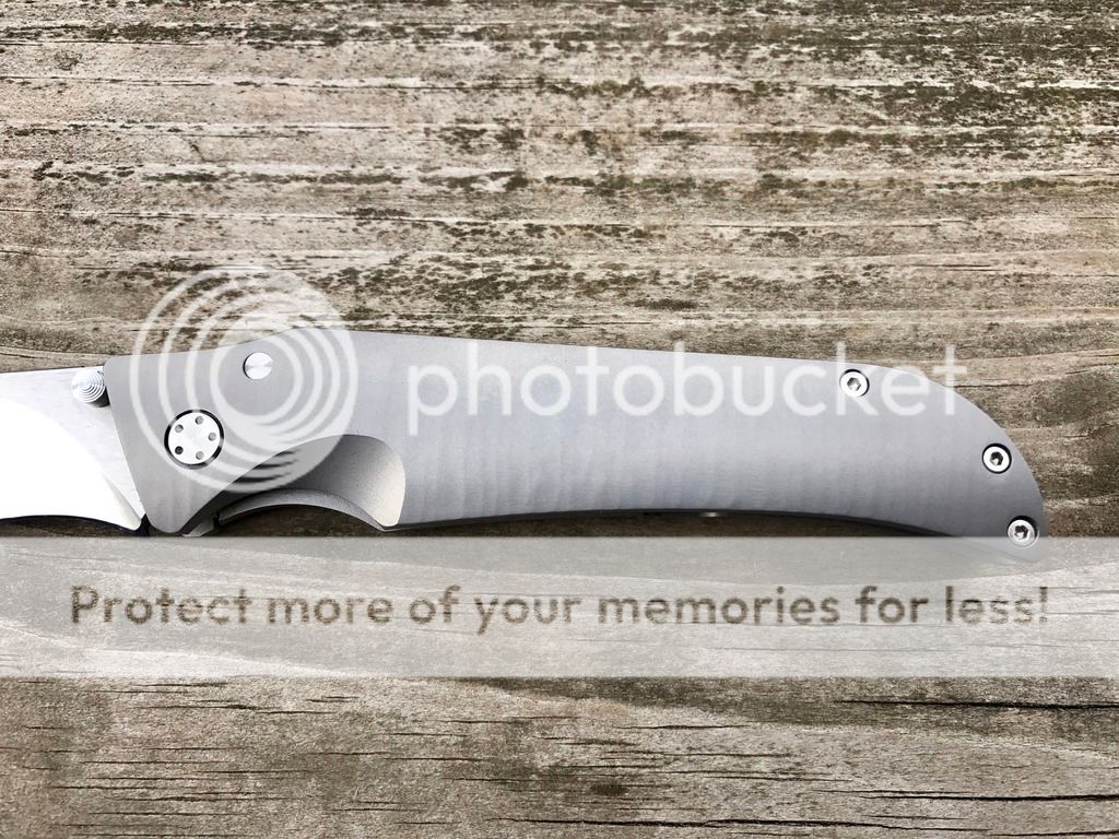 All of these knives are incredibly smooth, but this one holds the crown. Drops shut like a guillotine when you release the lockbar. Lockup is early, centering is perfect, razor sharp. Jason made a handful of recurve Rangers early on but has since stopped making them. This one has milled ripples in the titanium scales. These don't come up for sale very often.