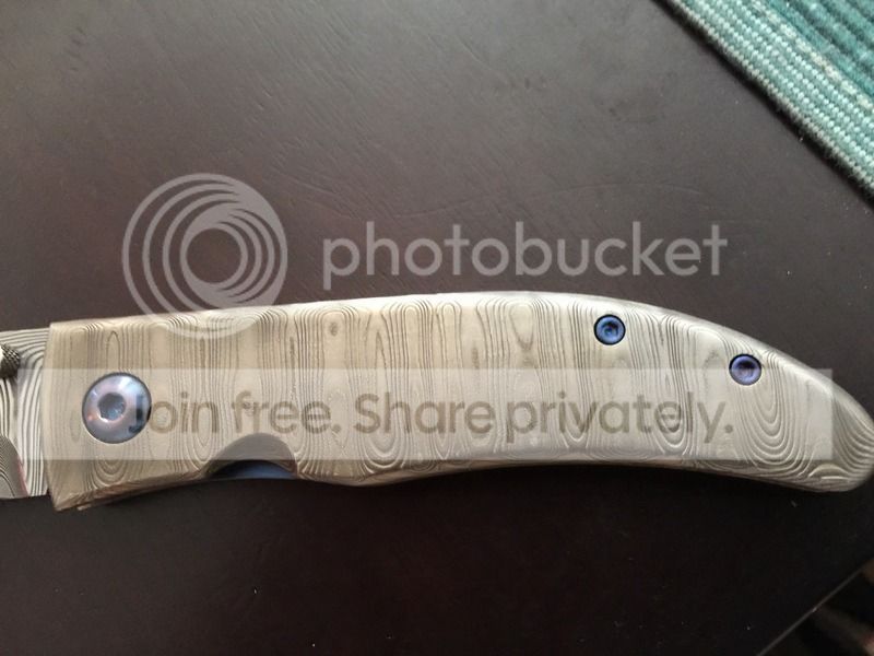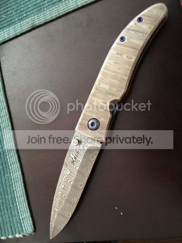 Made in 1999 when he was first starting out, my dad commissioned this piece. Blade and handle are Damasteel, with the handle having been etched to a very light gold/yellow color. Hardware is anodized blue. Knife has been in a safe all these years, never used or carried. Blade is about 3 1/2", false edge not sharp. $300 shipped in the US