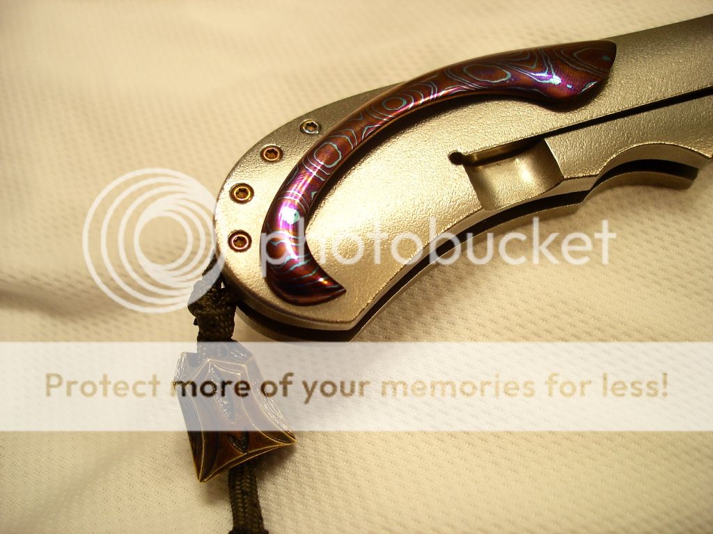 Contoured pocket clip and 4 turned standoffs are made of Timascus. Chinese hat pivot.