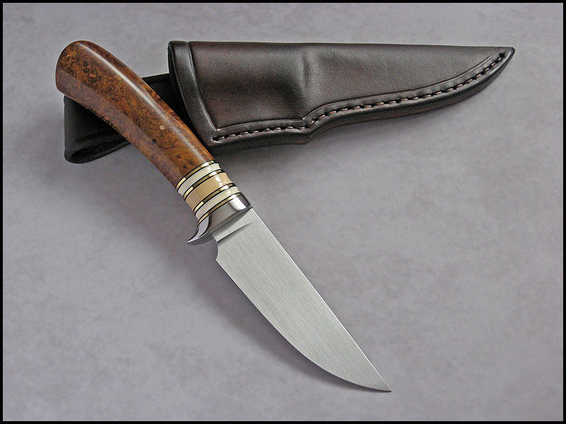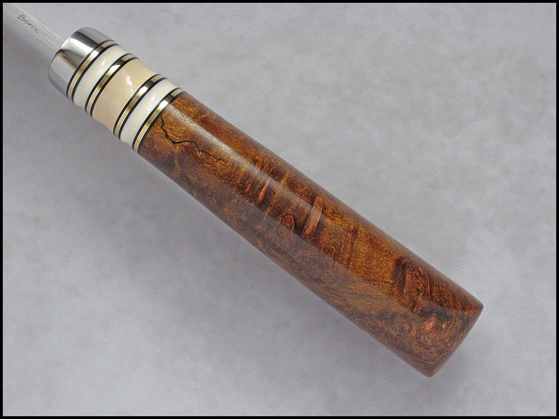 Another Jerry for sale. steel N690 / 3.5 mm [0.138"] length 218 mm [8.583"] blade 103 mm [4.055"] handle stainless steel, black fiber, brass, mammoth ivory, dyed and stabilized Maple burl, bronze pin sheath leather Price - 375 USD SOLD Included International Priority Mail