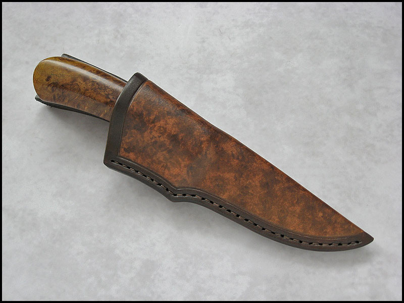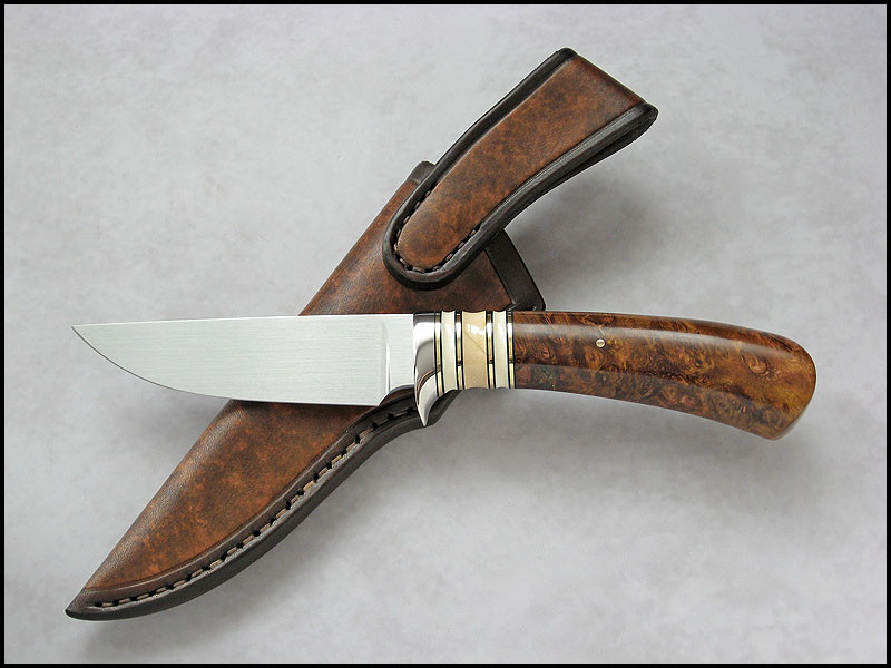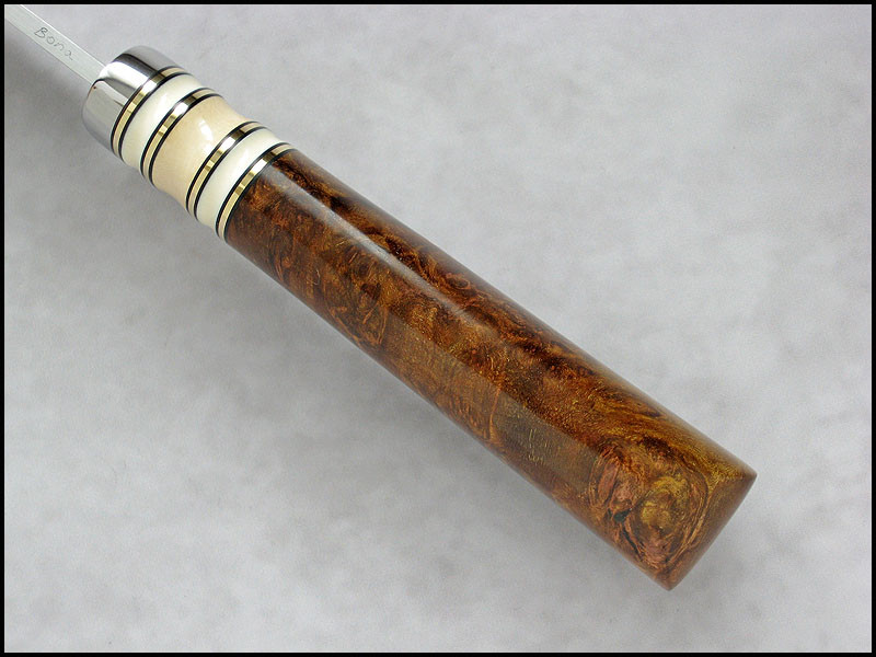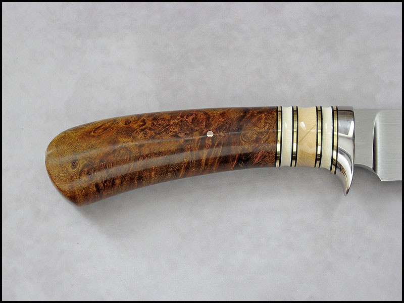 Jerry for sale. steel D2 / 3,5 mm [0.138"] length 220 mm [8.661"] blade 104 mm [4.094"] handle stainless steel, black fiber, brass, mammoth ivory, dyed and stabilized Maple burl, bronze pin sheath leather Price - 333 USD SOLD Included International Priority Mail