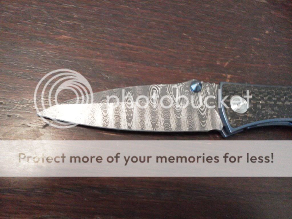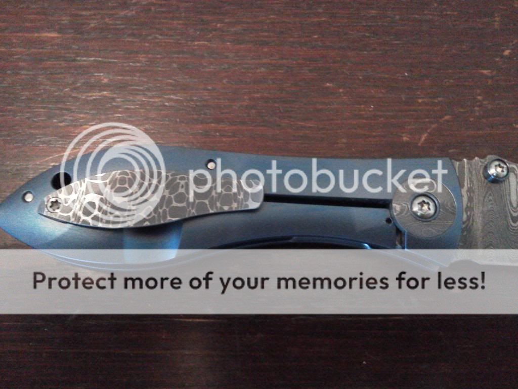 Nichols Stainless Damascus pocket clip, back strap and pivot ring as accents. Inlay on purple/blue anodized handle is lightning strike carbon fiber.