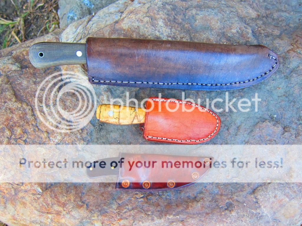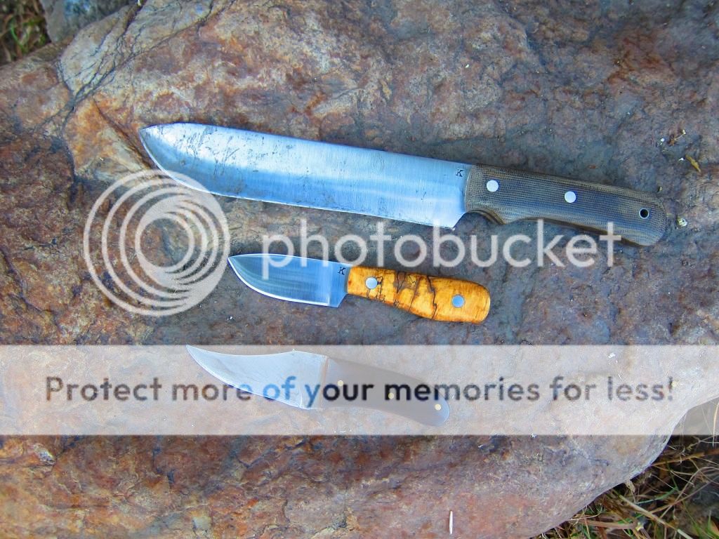 JK Camp knife modeled after John's first anniversary contest knife. Green micarta scales. Just a hair under 12" long. 7 1/4" O1 Blade in 3/16" stock. As you can see it has been used but not abused. I have done some crazy chopping with this thing. Sheath included. There is a super tiny ding in the edge which would come out with ease under a good stropping. John makes some of the toughest knives out here and I hate to let these go, but I can't keep them all. $170Shipped SOLD