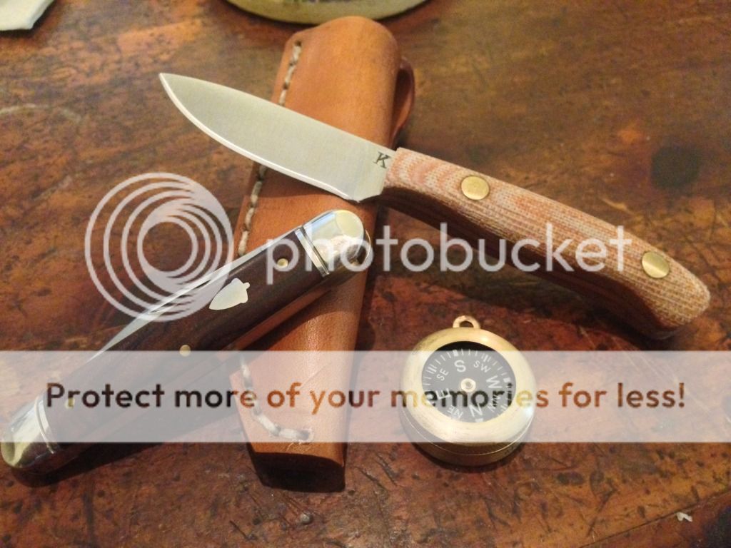 JK Tin Knife I won from the urban EDC contest with some black walnut burl legs and brass pins, with my (sitflyer improved) GEC Bullnose in 01 no less.