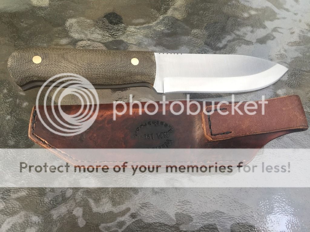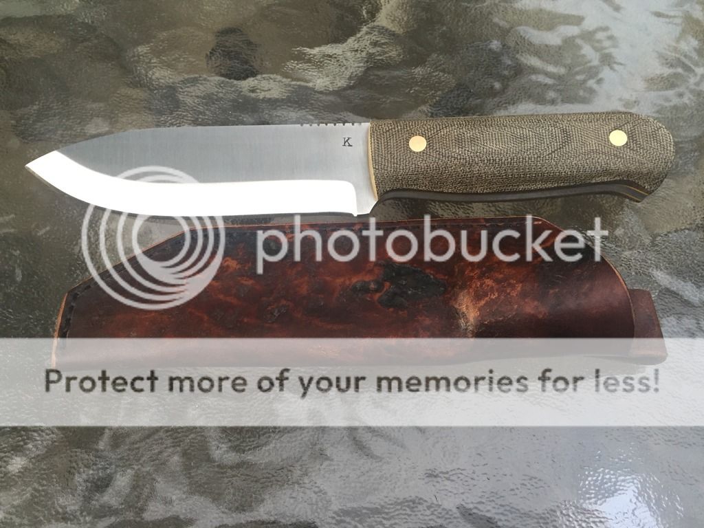 3.) JK Survival knife. OD Micarta, brass pins, yellow liners, 3/16" O1, 9 1/2" OAL. Wasteland leather works sheath, gorgeous and perfectly wet molded (Sheath alone was $80). Brand new never used.