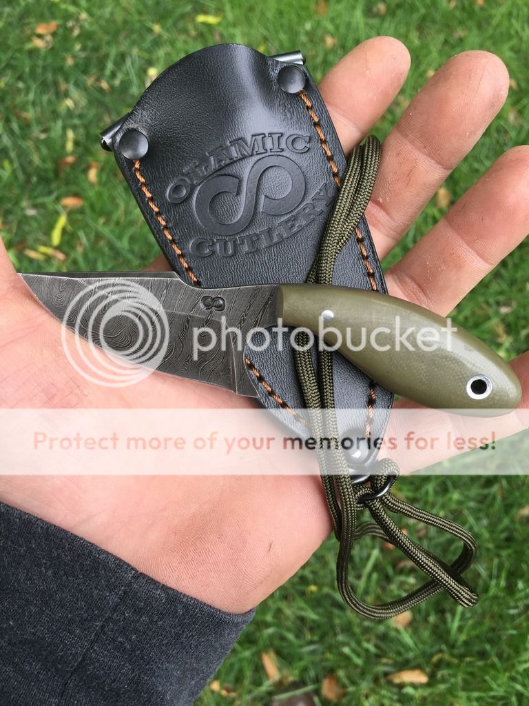 4.) Olamic Cutlery Neck knife. OD G10, Damascus blade, sheath, 5 1/4" OAL. Brand new never used.