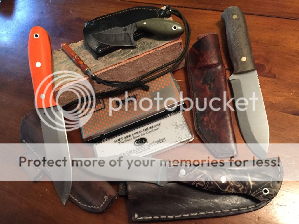 1.) JK Tool one off custom. Orange g10, 1/8" O1, scandivex, jimping, leather sheath, excel nano striker fire steel. 9 3/4" OAL. Lightly carried a few times. Striker fire used.