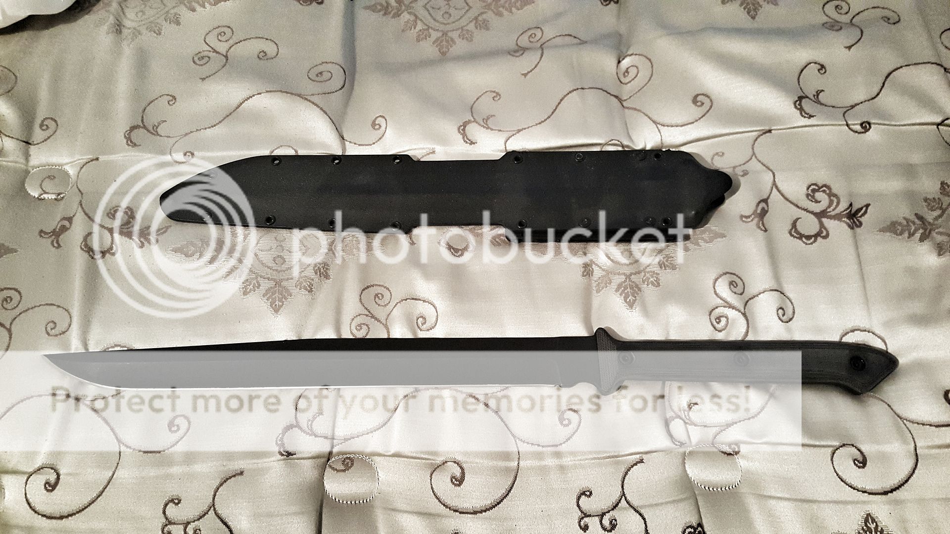 I have a never used John Gage Custom The Beast sword. Bought it last year sometime and I love it, but I just dont use it and need some quick cash. It is is pristine condition as from the John. The fit and finish are fantastic. Trying to get it out quickly. Spec are: Hollow ground 1/4" 5160 high carbon spring stee. 28 overall. 18" blade. Ceramic Gun Kote finish. Kydex sheath with Molle Lok. Weight 1lb. 12 oz approx. $800 OBO shipped.