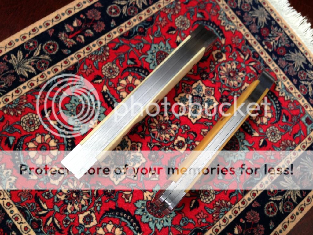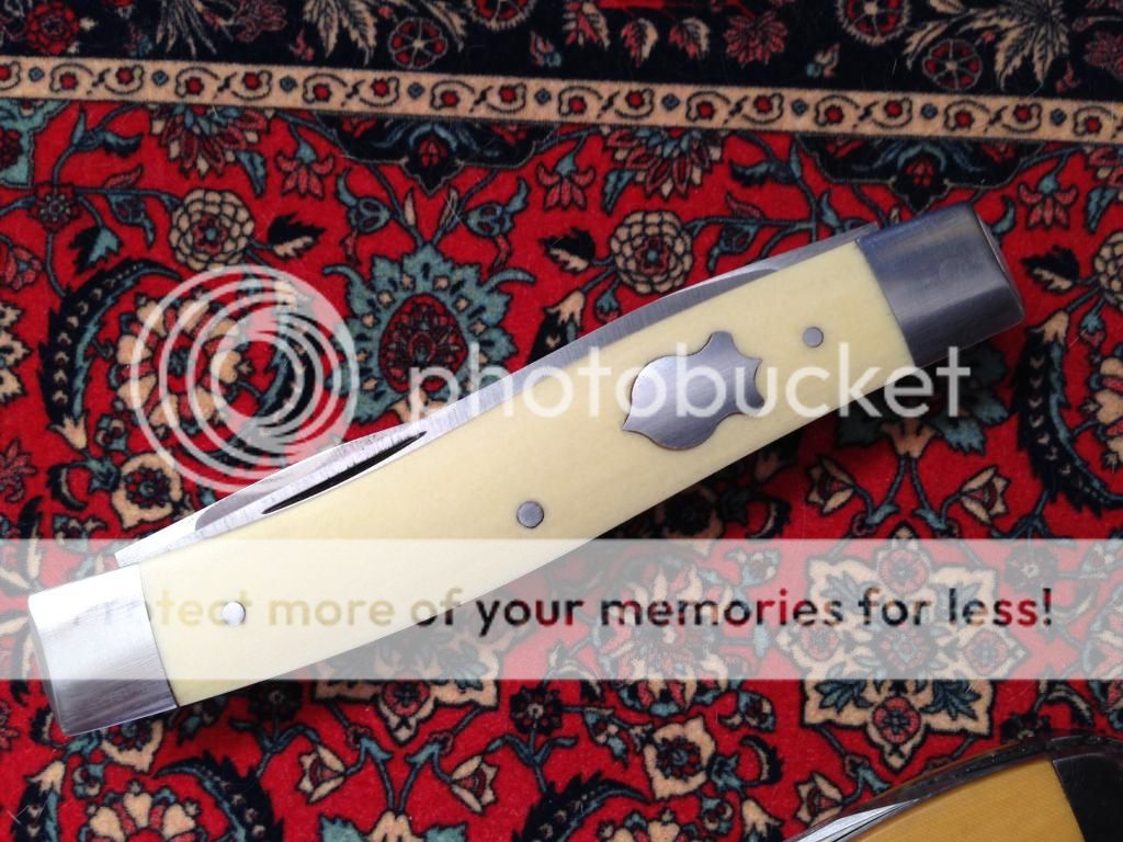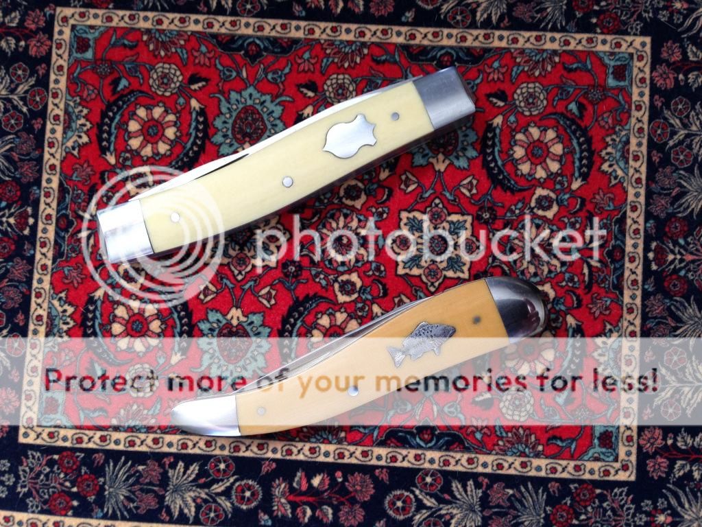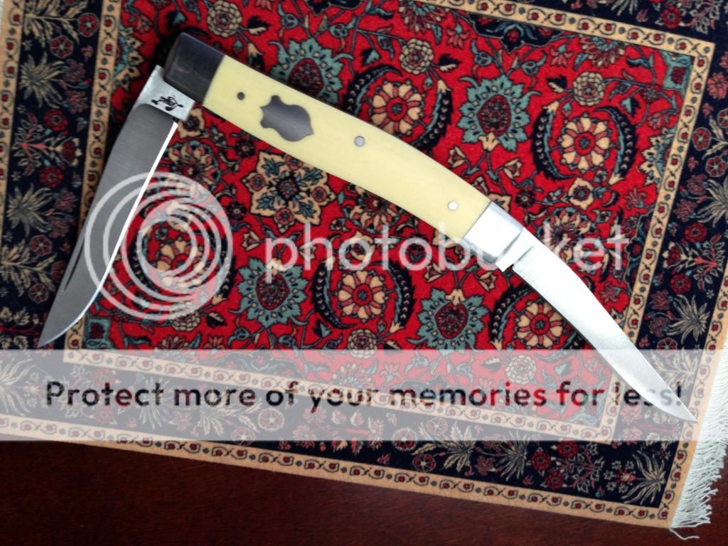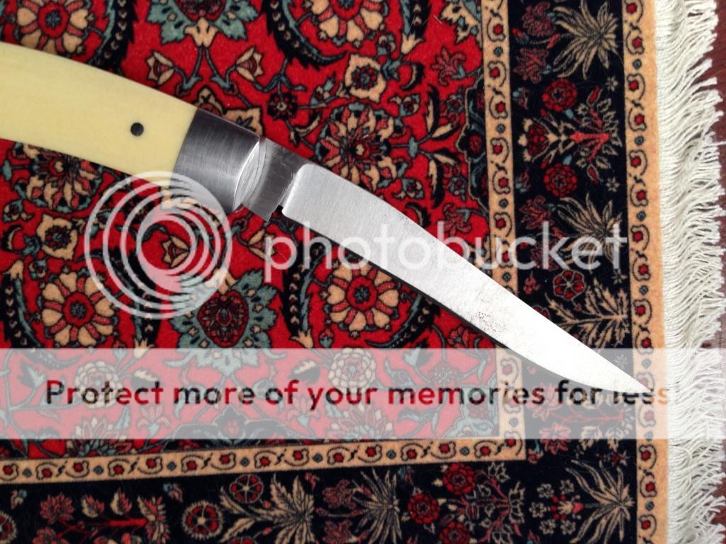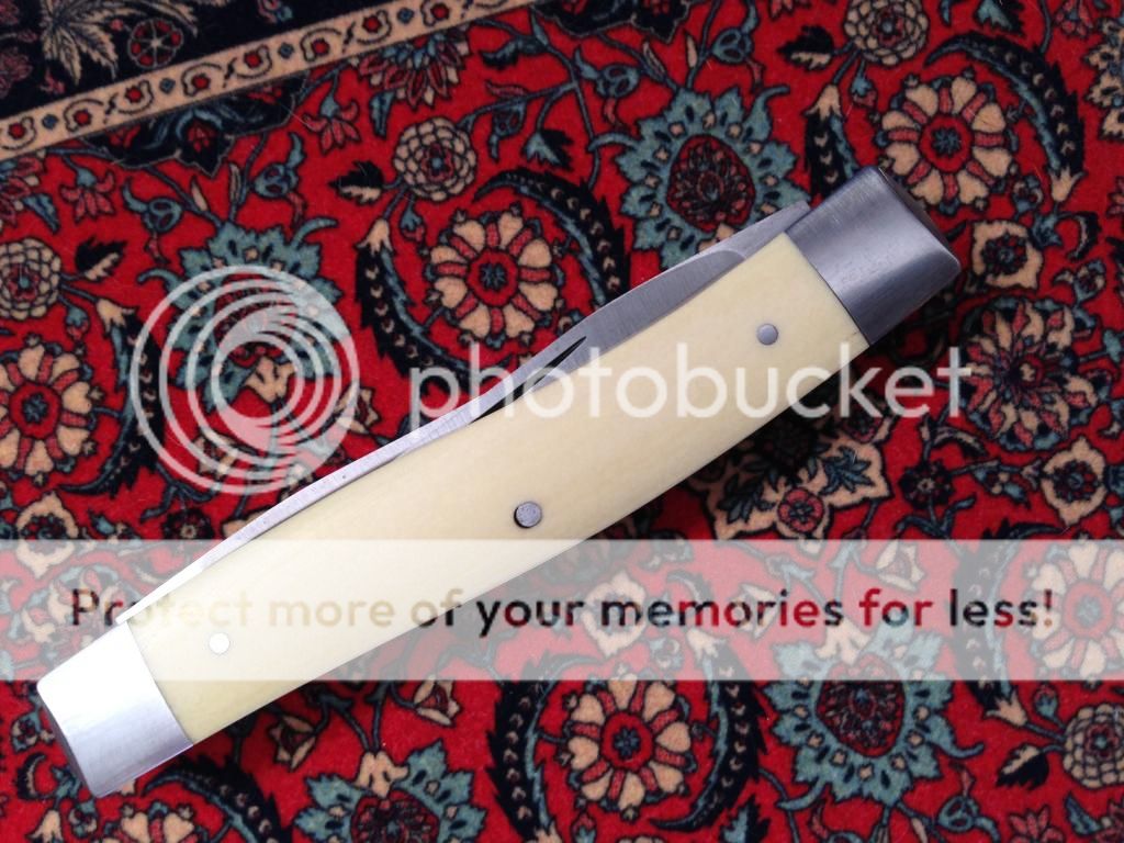 John Lloyd Muskrat - This is a cool one. Specially made to my specs, I wanted a big muskrat. This one is a handful at 4 1/4" closed. Stainless square bolsters, half-stops, double backspring, Westinghouse Ivory micarta covers (which are more yellowed than the pics show. More like an old mellowed, slightly yellowed elephant ivory). 52100 carbon steel blades, razor sharp. Great snap on the blades, no wiggle or wobble. This knife has been carried, though not much. Still has the original edge, I have not sharpened it. Some light freckling on the blades. Tons of character, this one.