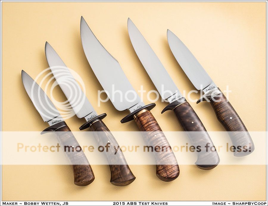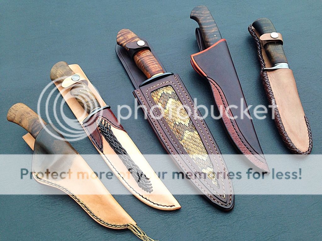 My father-in-Law Paul Wittle has finished the sheaths for my JS test blades. I am now ready to offer them for sale. From left to right they are priced as follows: