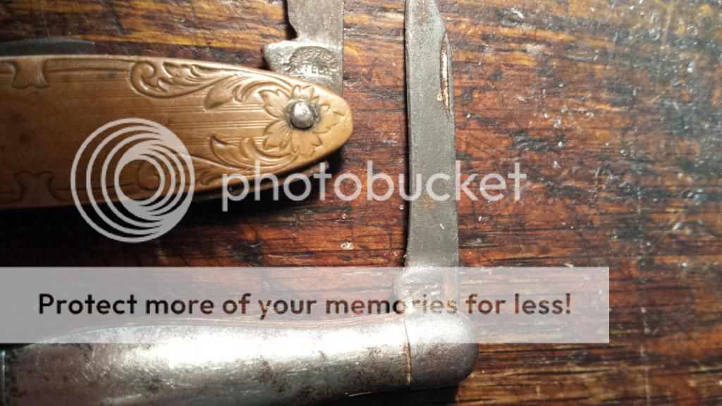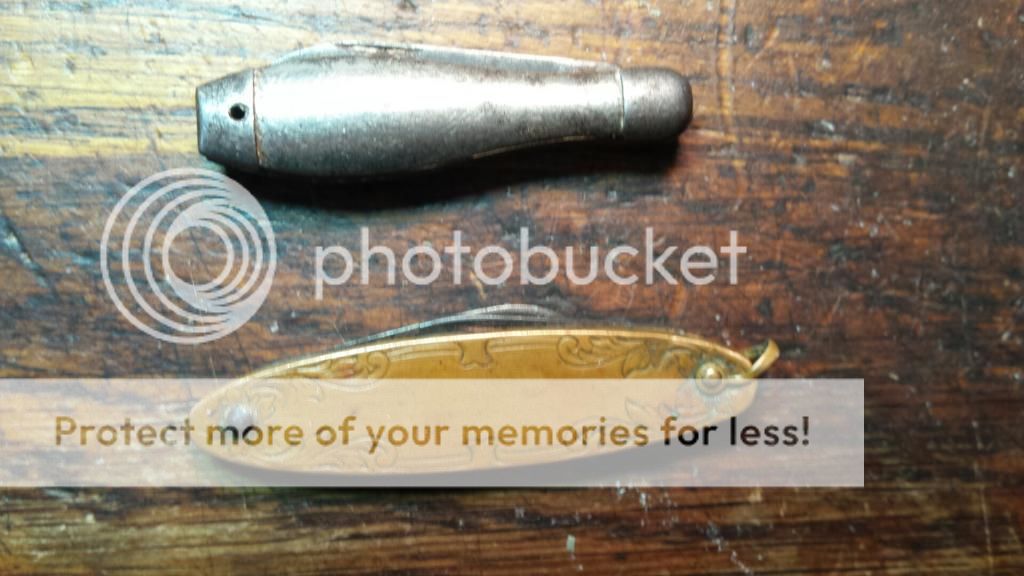 The little copper knife is pretty cool. I think it's an example of a "skeleton knife" The cutler would make the knife with plain scales, and a jeweler would put on gold or silver covers. This appears to be copper. The tang stamp says "Sheffield Steel" Does anyone have a guess as to its age?