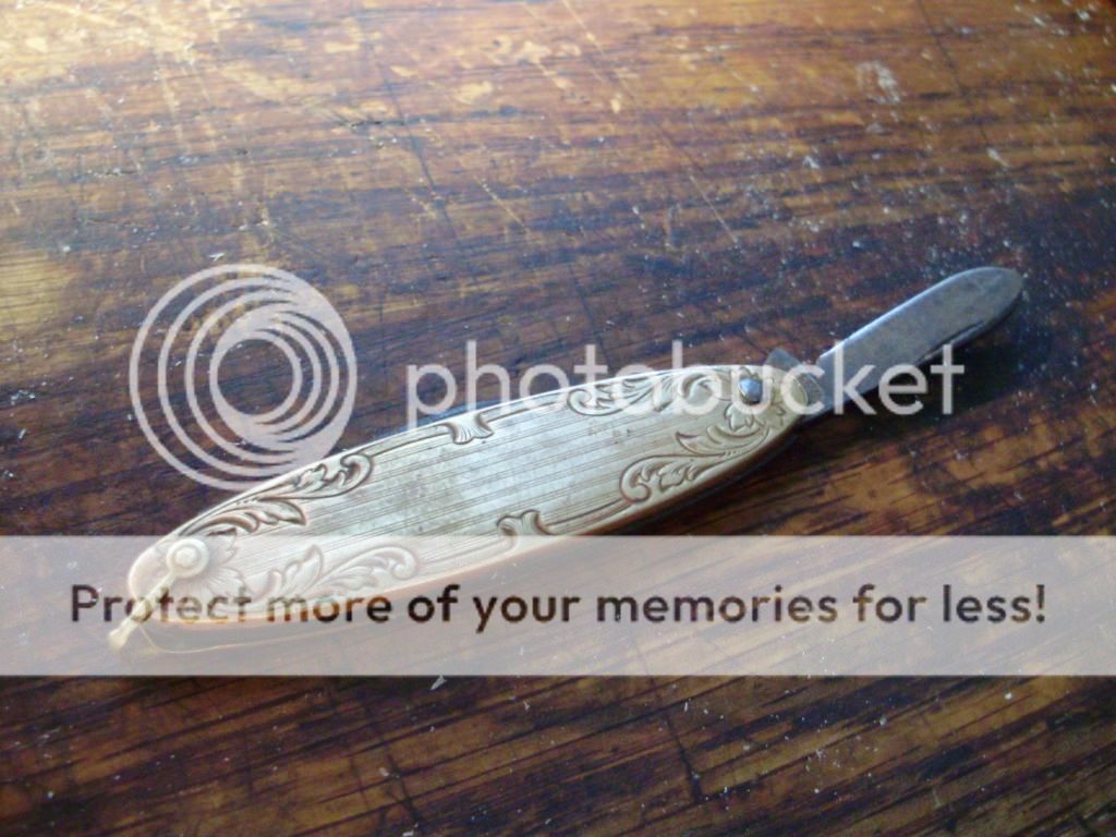 The bowling pin knife seemed very familiar to me. I remember seeing knives like this with white cell covers. It is the kind of little souvenir knife that Colonial or Imperial used to make. I can't make out what the tang stamp is on this one. Kind of looks like an anvil?