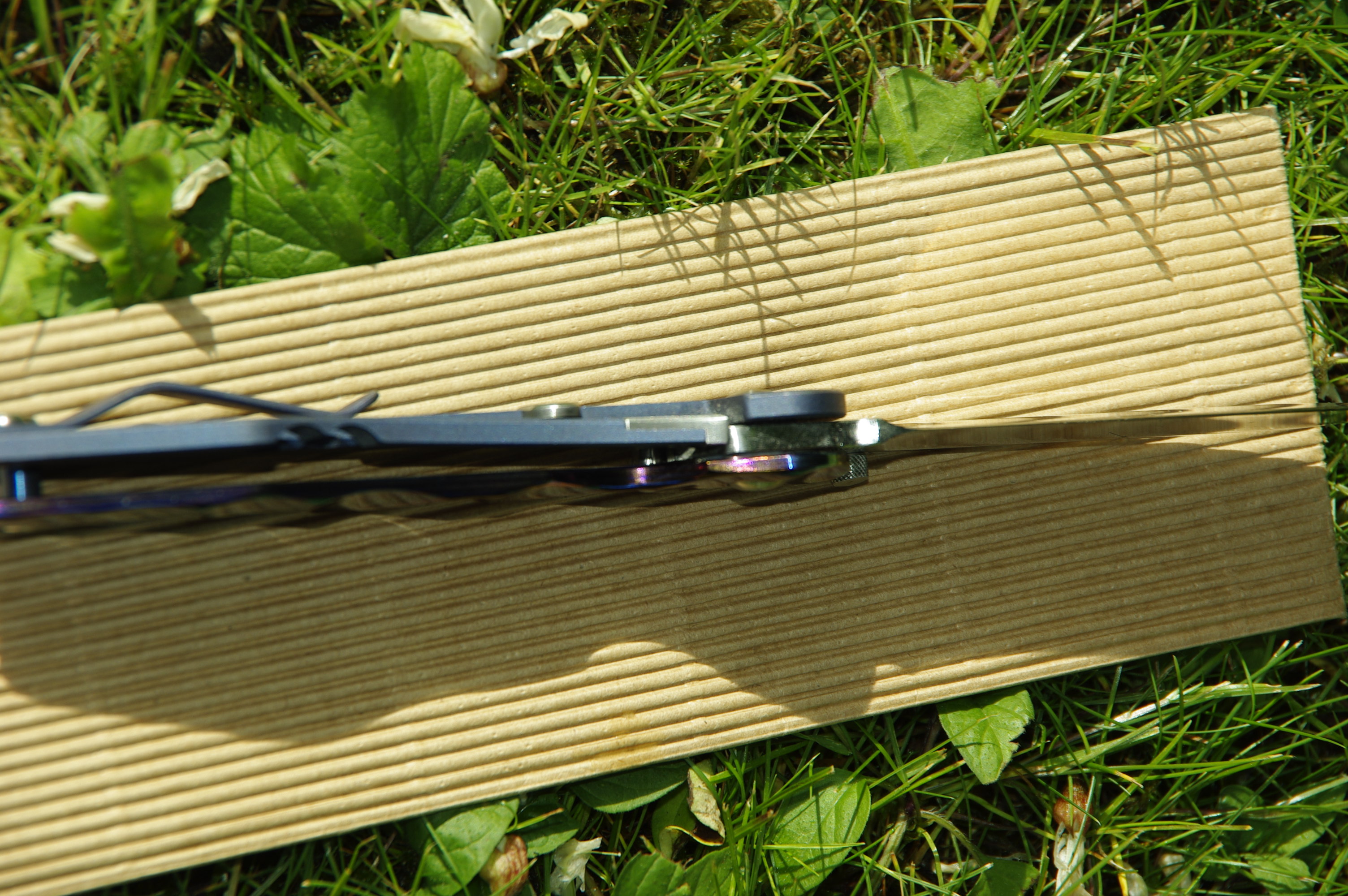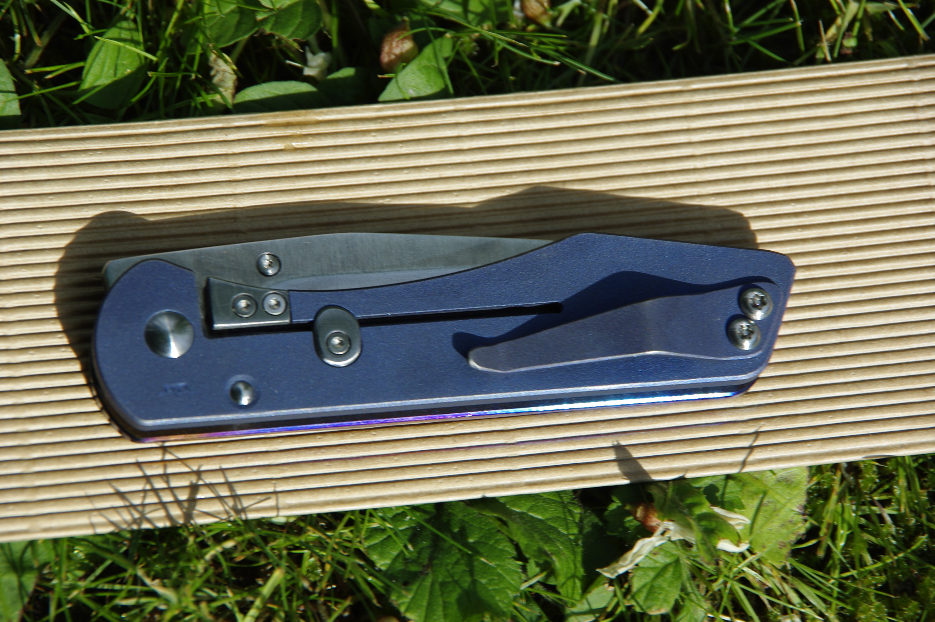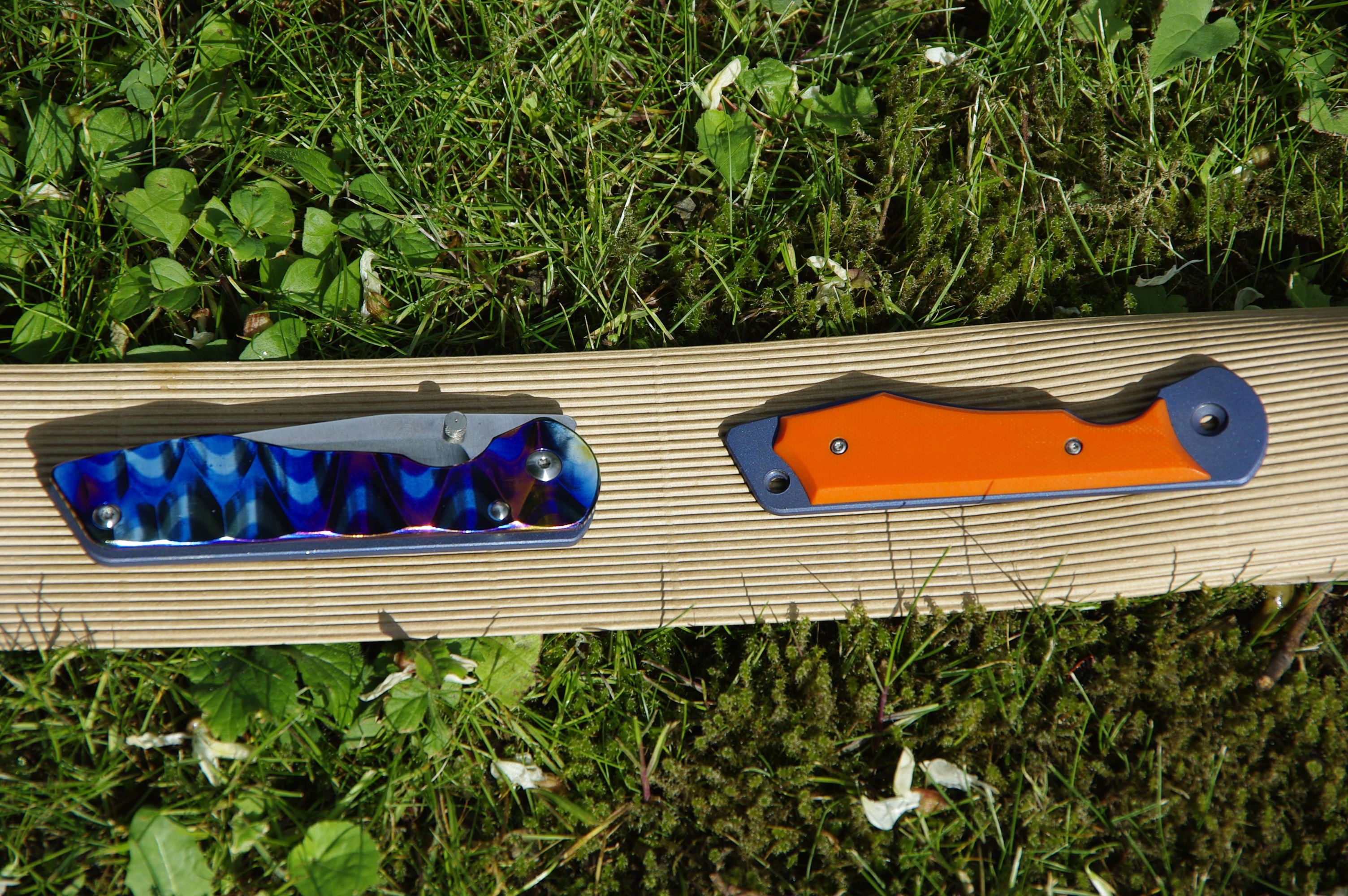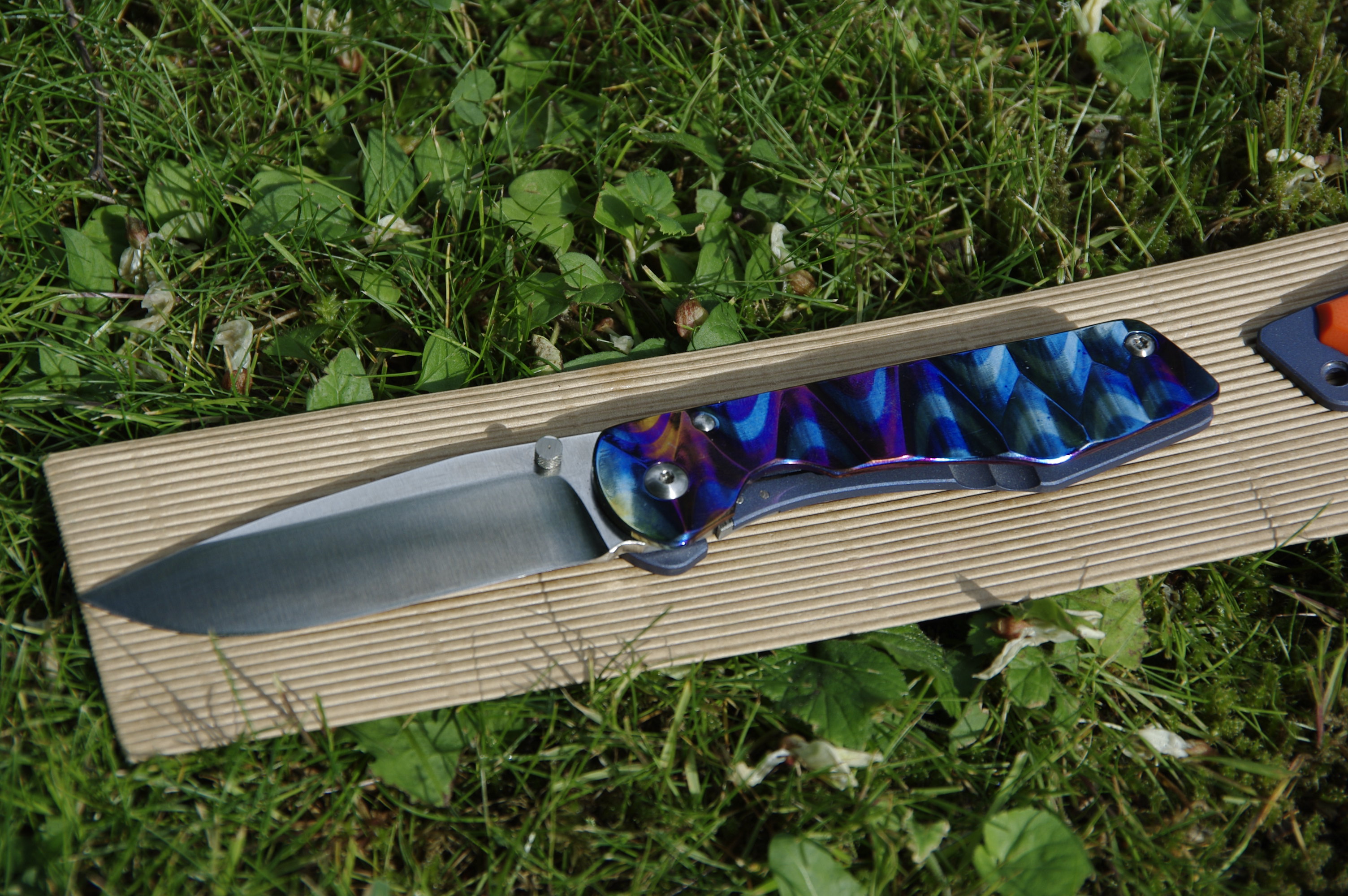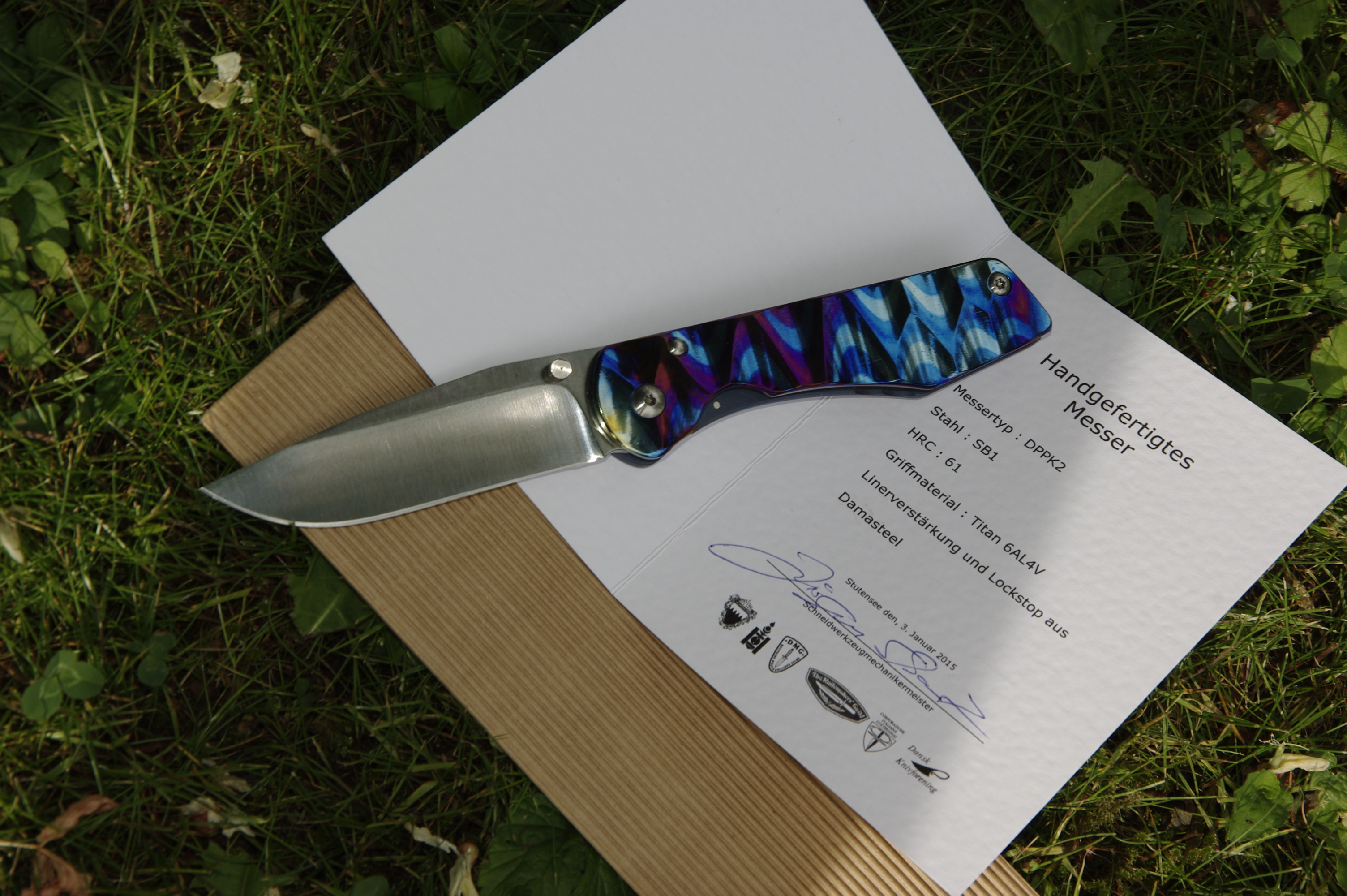 For sale is a framelock folder made by the German knifemaker Jurgen Schanz. The blade length of the model DPPK2 is 3.74in OAL 9.65 in. The upper scale is made of titanium-VA laminate with a beautiful colours. There is also a second upper scale made from titanium and a G10 onlay. The knife was carried, but almost not used. There are some very small micro scratches on the clip.
